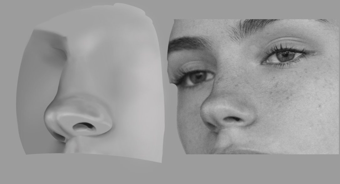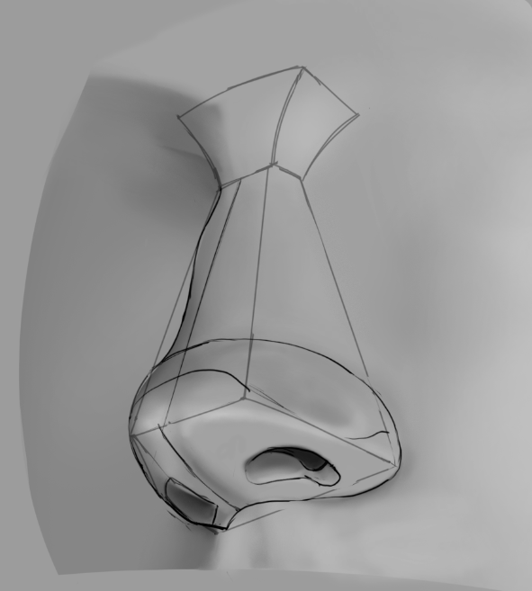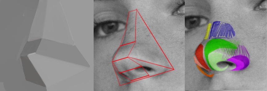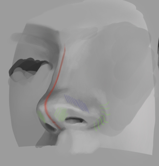 >>937763 Первого достаточно, но если и обрубовку сделаешь, то станет еще проще. Просто можно зайти цветами сначала на фото и найти все части носа перед тем как рисовать. У тебя нижняя часть слилась воедино, хотя там сплетение двух хрящевых форм. В итоге добавочный хрящ совсем исчез, нехватает его округлости. Ты сразу и сделал одну плоскость вокруг ноздри и убрал закругление добавочного хряща сделав твердую границу между его краем и кожей лица. Поверхность которая закругляется от нас должна имать какой-никакой переход, не резкую грань. Так же пропал и маленький треугольничек между верхним и большим хрящом