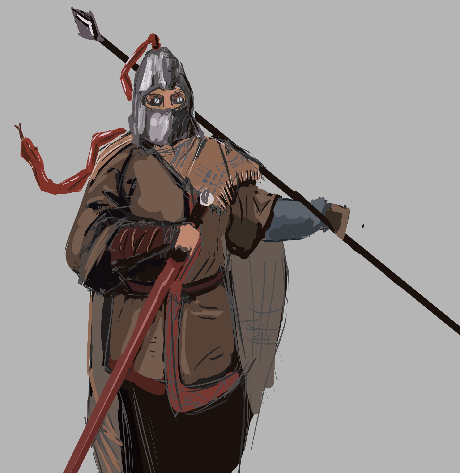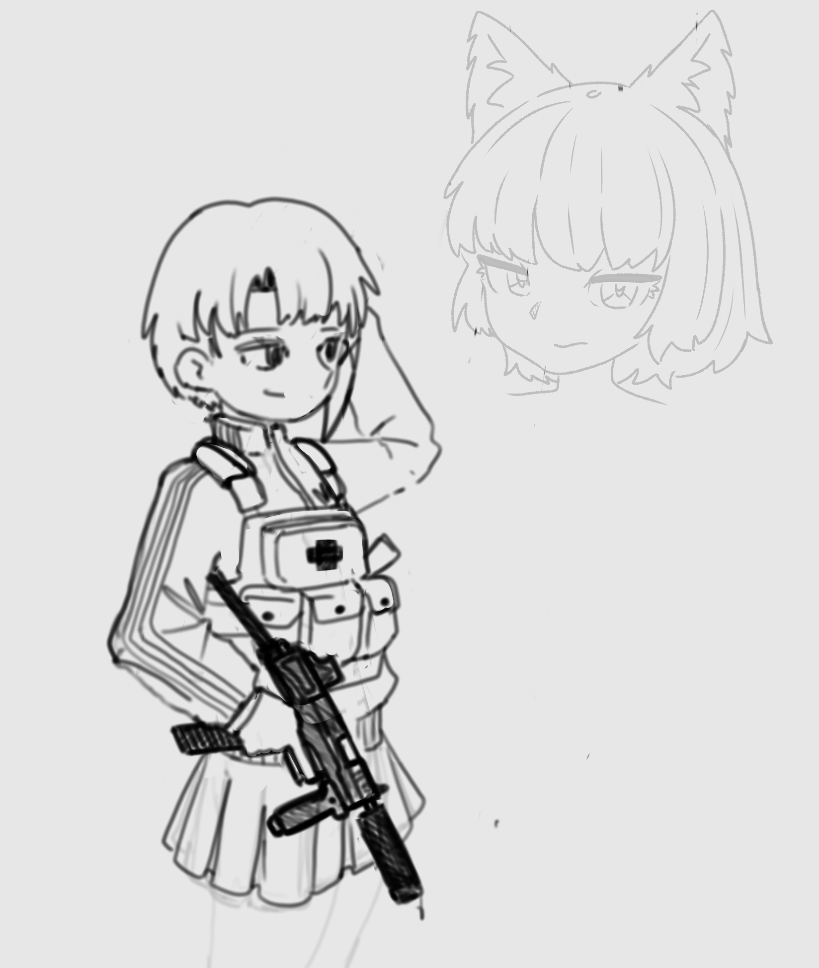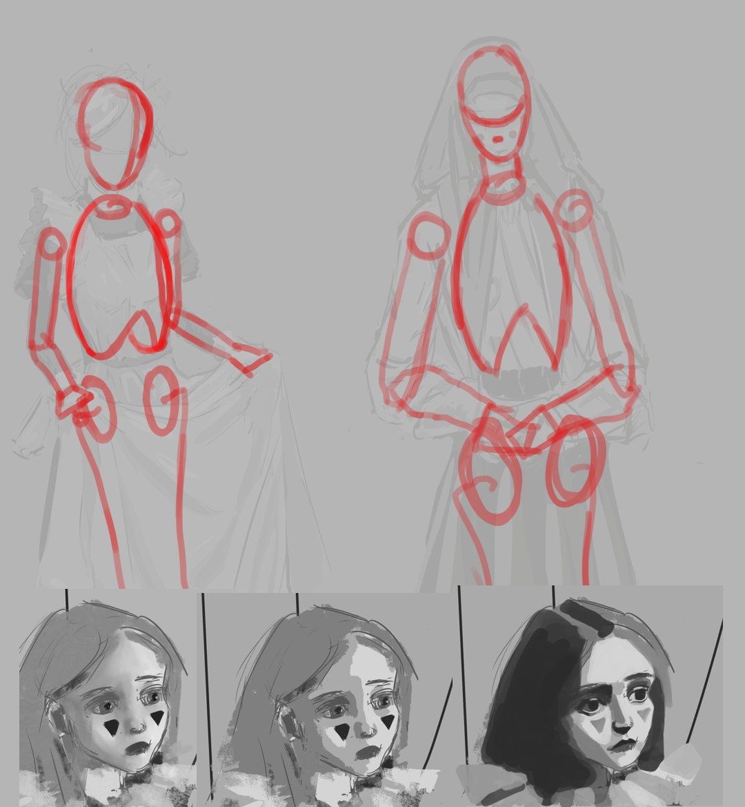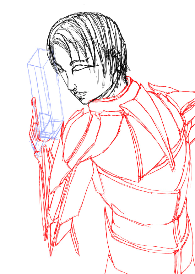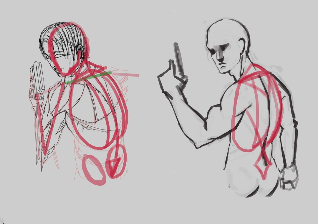 >>938081 И так и так к твоему килли подходил, в итоге всё-таки смог сформулировать. Даже в личнотред заглянул. Ты правильно делаешь что сначала конструируешь, но у тебя не от чего оттолкнуться чтобы проверить свою конструкцию. Ты хоть к третьей ревизии немножко выправил от изначальной схемы, все равно остались плывующие в разные стороны части и даже намечается некая обратная перспектива, где затылок и дальнее плечо больше того - что ближе. Но и наиболее главная проблема, это то что поза какая-то зажатая и невнятная. Она должна быть героичная или трусливая, защитная или реакционная? Пока что он как-то свернулся как девственник, прижимая свой пистолет к телу.