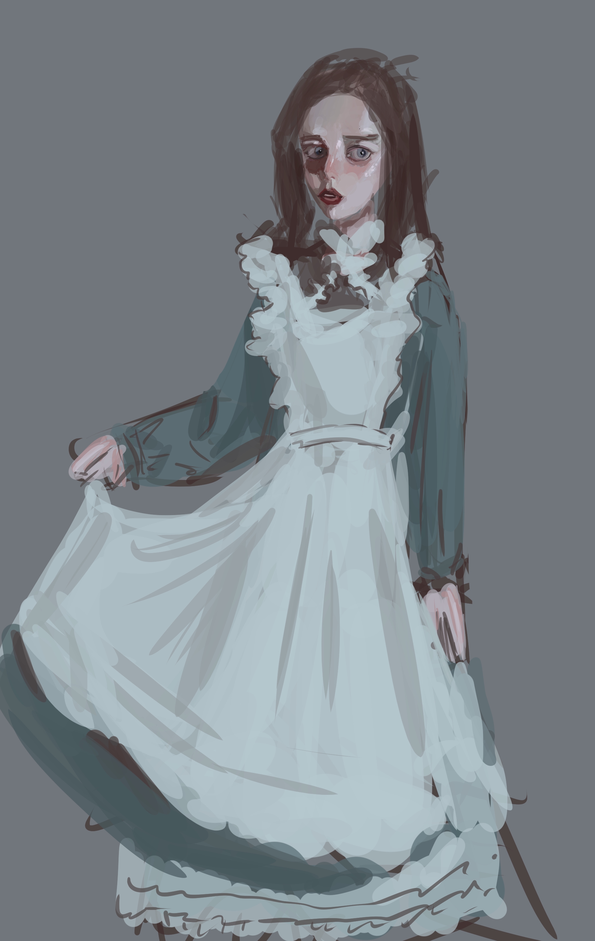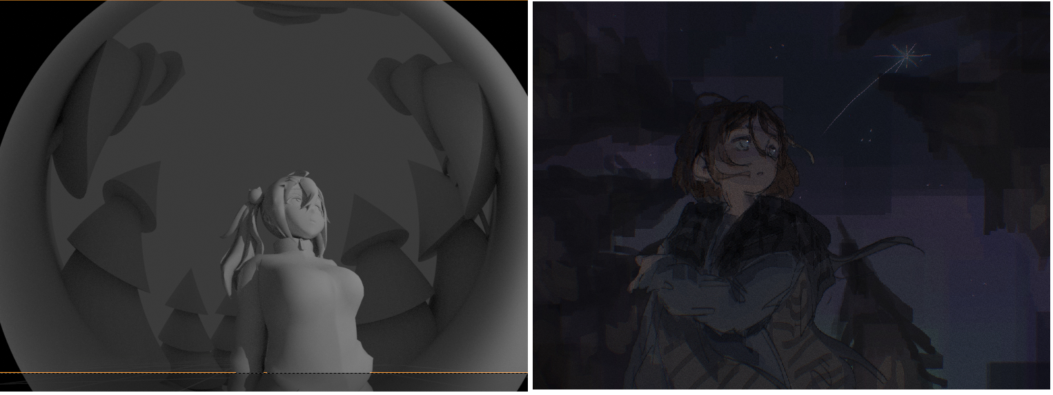 >>938152 Короче это была сделать ракурс очень снизу + перспективное искажение что ближе к зрителю увеличивается тело, но так может выглядеть будто жирно, поэтому сильно искажения не было, и ракурс головы из-за тени кажется недостаточно низким, она реально не оч вписывается в фон, у фона драматичный ракурс, у нее обычный, ну так получилось, это не задумка