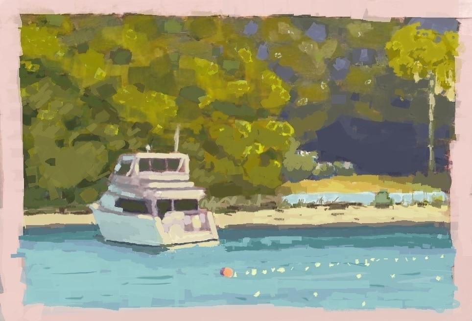 >>938014 Если яхту прописать подробнее и еще контрастнее при этом, то она будет оттягивать взгляд на себя и глаза не уйдут на ближайшие деревья, к дальним, к песку и опять на воду к буйку и катеру и так по кругу