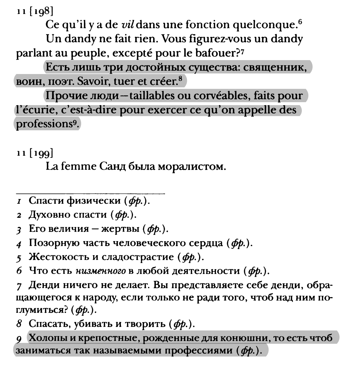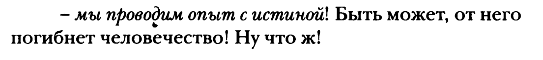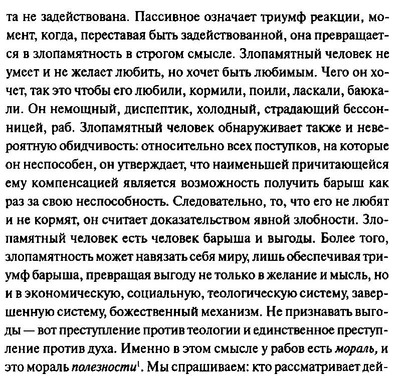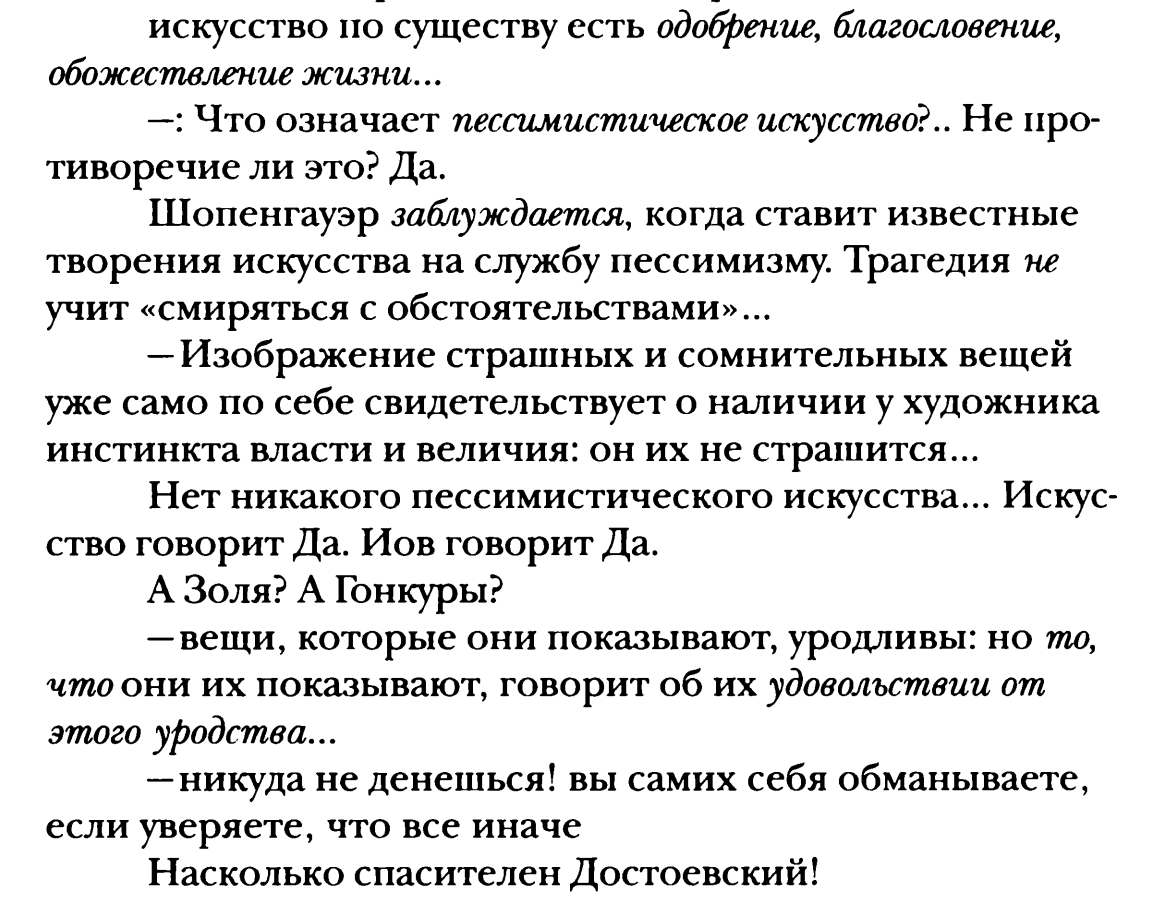 >ни разу не написал, как должно быть «Людям, до которых мне хоть сколько-нибудь есть дело, я желаю пройти через страдания, покинутость, болезнь, насилие, унижения — я желаю, чтобы им не остались неизвестны глубокое презрение к себе, муки неверия в себя, горечь и пустота преодолённого; я им нисколько не сочувствую, потому что желаю им единственного, что на сегодня способно доказать, имеет человек цену или не имеет: в силах ли он выстоять...»