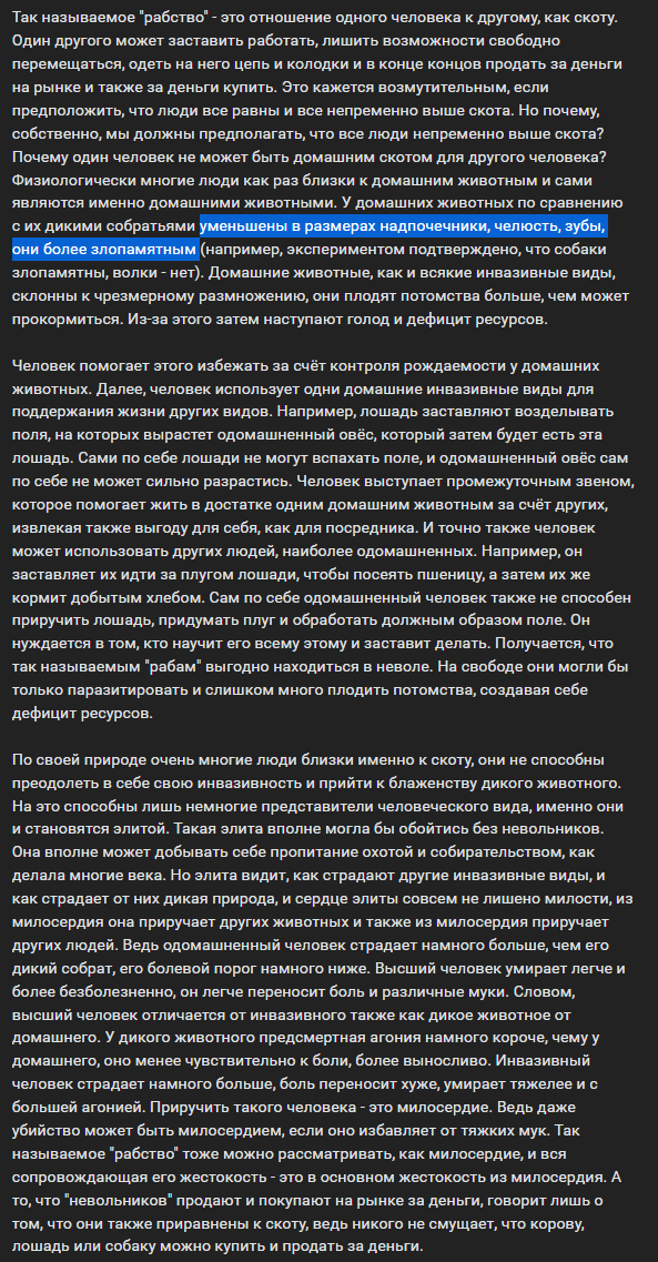 >>179115 >потерял в этих самых людей веру Какая именно вера в людей у тебя была? Что они соберутся вместе в картель чтобы производить намного больше колбасы? Что они будут применять только инстинкт эмпатии и не будут применять инстинкт агрессии? Умные пессимисты разочаровывались не в том, что люди слишком злые или глупые чтобы создать добрый и приятный мир, в котором все будут друг друга любить, а в мейнстримных культурных представлениях о человеческой природе, в "идеалах", у которых нет никакого субстрата — кроме иллюзии, которую представляет собой культура, надстройка над инстинктами, служащая инстинктам.