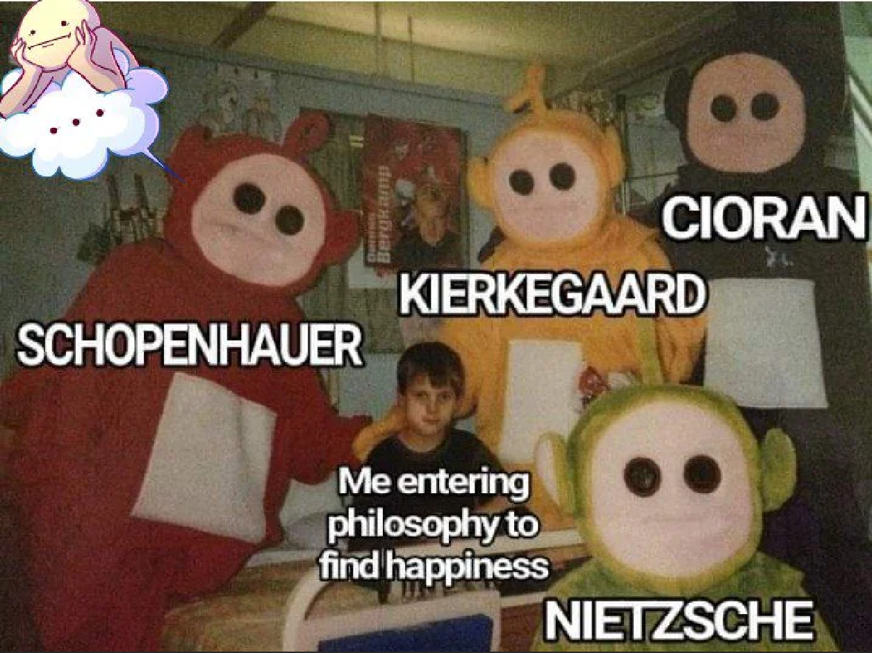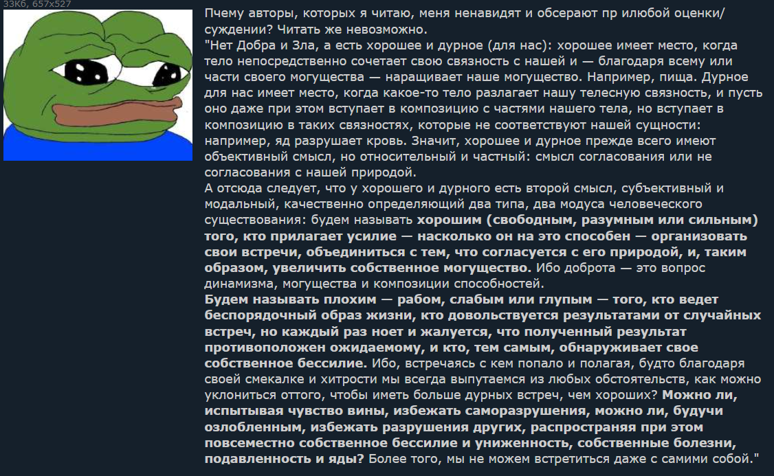 Нет же такого катастрофичного сценария, что чел прочёл книжку и вздёрнулся. Или что у него жизнь теперь в разъёбе. Тебе нравится девочка из вебм или нет? Детям своим что будешь рассказывать? За какую партию будешь голосовать? О чём ты будешь разговаривать с коллегами на работе? Тебя защищают законы на улице, поэтому тебя тут не бьют, но из-за финансового кризиса ты обрёл какое-то решение, тебе нужно искать работу. Помойся, а то будешь как чухан. Вышли какие-то видеоигры новые, можно поиграть и развлечься. В доме что-то сломалось, надо починить. Смотри, какая-то новая философия с какими-то новыми аргументами. На пятьдесят шестом YouTube канале, на который я подписан, вышел новый клёвый видос про историю режима Франко. А у аудио рв был клёвый видос про инцела Поднебесного, над которым я смеялся, потому что он выглядит шизнево и кринжево, а мне важно, чтобы было прилично, красиво, по нормам общественным и не смешно, так далее. Знакомый скинул смешной мем. А вы тут спорите о какой-то залупе, как будто сейчас судьбы мира решаются. Там хрюсы трансов запрещают, вы читали новости, не? И правильно делают, потому что леваки совсем уже с ума сошли до ощущения неприятного абсурда, возникающего при чтении новостей. Должно быть не абсурдно, не так ли. А как же философский пессимизм? Дак а это игрушка не для этих новостей, под них-то другие взгляды. Например, что не должно быть тоталитаризма неприятного или абсурдного кринжа. Ну вот и всё. Вам можно было бы подождать, пока философский пессимист начнёт разговаривать о чём-то другом, смотря на что-то другое, и тогда уже не нужно спасать планету от негатива, оспаривая в середине третьего десятилетия двадцать первого века философские посты молодого русскоязычного двачера, скептицизм которого развит хотя бы потому, что он живёт не в селе 15 века, где у тебя нет ни рынка идей, ни выбора, во что тебе верить, а в современности и в информационную эпоху с интернетом и школьным образованием.