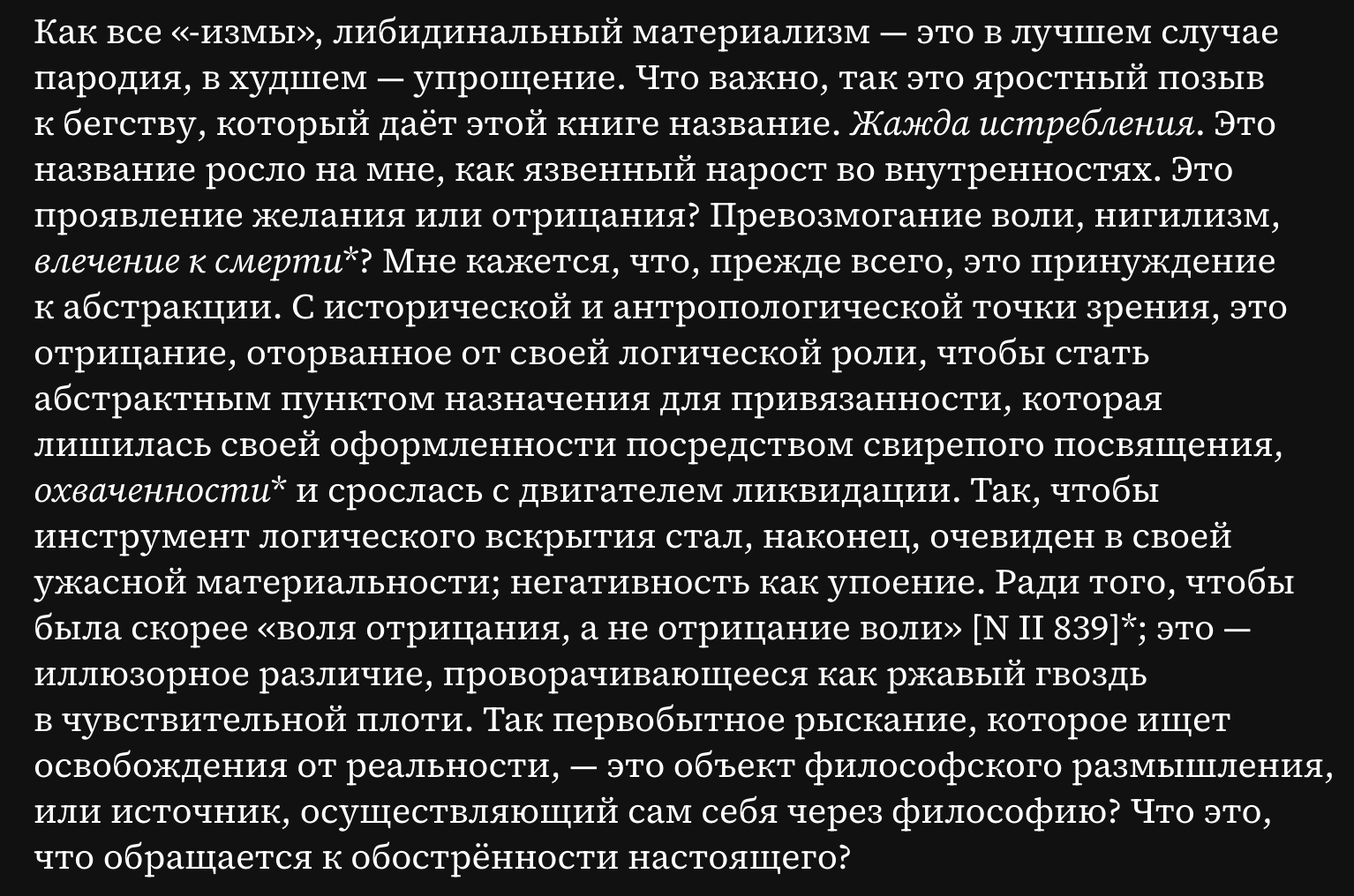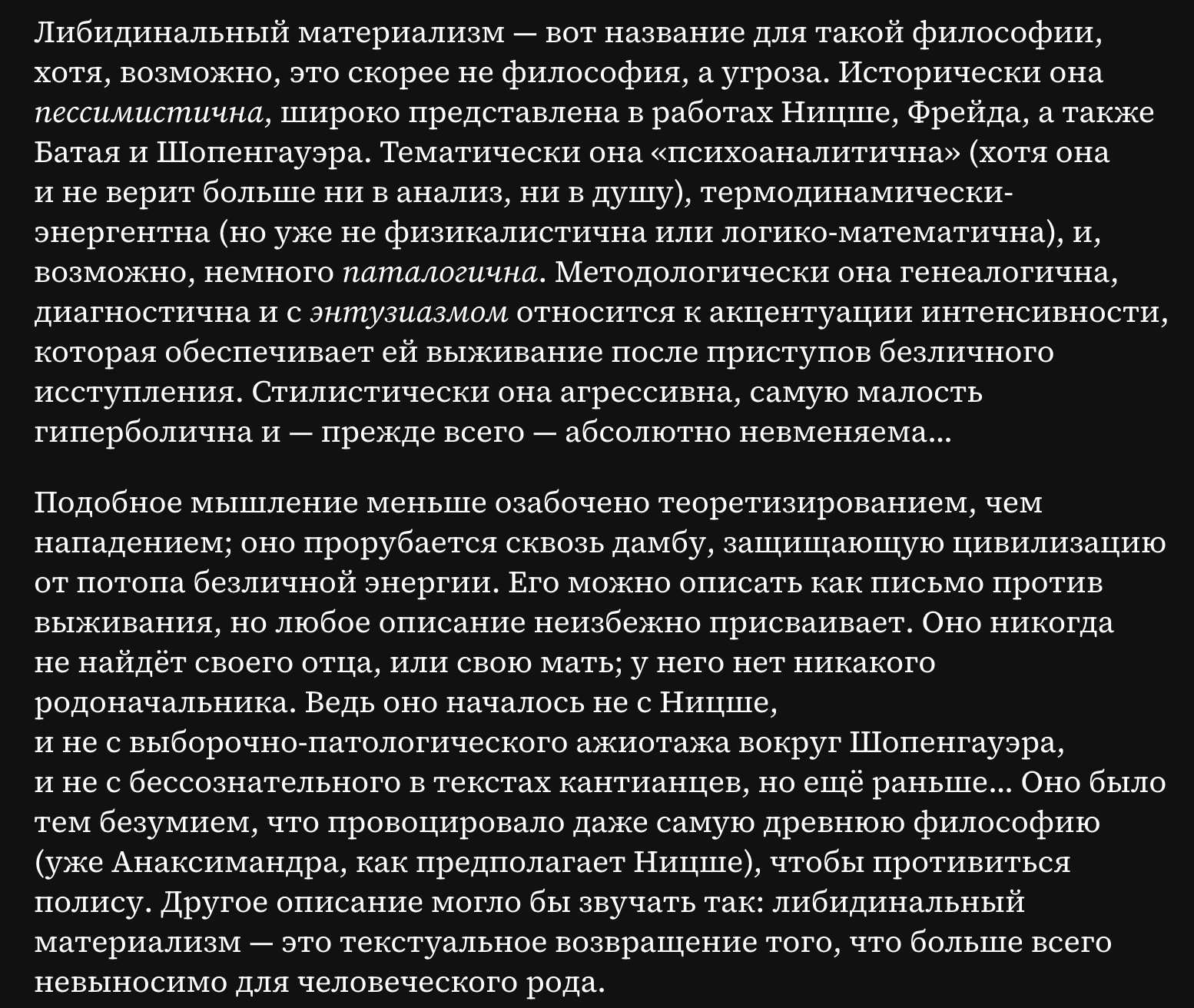 >>175677 В философском пессимизме, то есть в тех трудах, которые я читал, либо в тех трудах, о которых я слышал, приятный лично для меня фокус на жизнь, а не на субъекта, то есть он как бы есть, но находится в жизни, какая анализируется или комментируется, но там ещё его судьба есть, живого существа или человека. В каких-то местах есть приятный налёт объективизма, такая как бы незначимость человеческого мнения, ведь факты жизни говорят об обратном. В каких-то частях иногда хорошее настроение показывается как результат биохимии в организме. Мне нравится философия, которая дезначимизирует человеческую мысль или его субъективность. Там не совсем так, как я написал, но вайб приятный иногда. Мне просто в принципе не нравится философия, какая придаёт излишнюю значимость человеческой мысли, вот. Про оппозицию не знаю, чё спизданул, какая-то хуйня в голове была, наверное