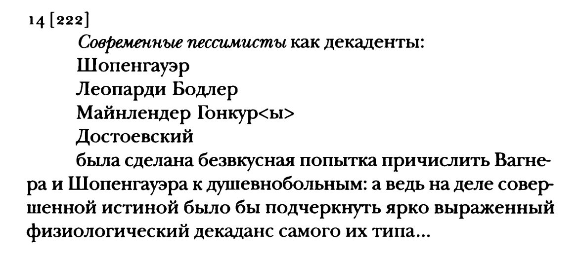 Кстати, читаю сейчас КГМ, там Ницше пишет, что душевное страдание это не факт, а "моральная"(?) интерпретация... Но в то же время в этом же труде он поливает помоями "слабых", "жрецов" и всех тех ему не нравится, призывая читателя, если тот ему не угодил, испытывать угрызения и нечистую совесть, "самоколесоваться". Но при этом он ни разу не написал, как должно быть. Спроси любого пост/ницшеанца, что делать слабым, завистиливым, убогим, идеалистичным и он изойдёт на ярость и слюни, как любой хрюс. >>147528 Об этом же пишет сам Ницше в главах 15-26 КГМ. Но ницшеведы зачастую чсами не читали Ницше или проглотили его пролайферскую мишуру. >>147526 Чел, ты ведь понимаешь, что я тоже могу нацитировать Ницше.. И для мужества нужен тестостерон, 21 век, ноука, ау. У меня вот тестестерон как у ребёнка, и у меня никакого мужества быть не может по определению. Все эти аффекты детерминированы гормонами, характером, генетикой и средой. > Тем временем я проделал серьезный объем работы по ревизии и подготовке новой редакции моих старых работ. Если мне скоро придет конец — а я не скрываю, что желание умереть становится все глубже, — все-таки кое-что от меня останется: некий пласт культуры, заменить который до поры будет нечем. > Мое существование – ужасное бремя, я бы давно отбросил его, если бы именно в этом состоянии страданий и почти абсолютного отречения мне не удавались поучительнейшие пробы и эксперименты в духовно-нравственной сфере. Эта жаждущая познания радость поднимает меня на высоты, где я одолеваю всякую муку и всякую безнадежность. В целом я счастливее, чем когда-либо в моей жизни, и все же!.. Постоянная боль, по много часов на дню ощущение полу-парализованности (сродни какому-нибудь душевному заболеванию), когда речь дается мне с трудом; на смену приходят яростные приступы (последний – когда меня рвало три дня и три ночи; я жаждал смерти). Не иметь возможности читать! Писать очень редко! Не общаться с людьми! Не иметь возможности слушать музыку! Прогулки в одиночестве, горный воздух, молочно-яичная диета. Все прочие средства смягчить состояние оказались бесполезны, мне больше ничего не подходит. Холод очень вреден для меня. > Ибо ужасная и почти не прекращающаяся пытка моей жизни заставляет меня жаждать конца, и, по некоторым признакам, спасительный удар уже достаточно близок и я могу на него надеяться. Мучения и самоограничения в последние годы сделали мою жизнь вполне соизмеримой с жизнью какого-нибудь аскета прежних времен; > ..отнюдь не «гордое молчание» сомкнуло мне уста, так что я в последнее время почти ни с кем не общаюсь, а, скорее, смиренное молчание страждущего, который стыдится демонстрировать свои страдания. Зверь, когда болен, залезает в пещеру — так же поступает и la bête философ. Дружеский голос так редко долетает до меня. Сейчас я одинок, абсурдно одинок, и в своей безжалостной подземной войне против всего, что до сих пор было чтимо и любимо людьми (моя формула для нее — «Переоценка всех ценностей»), сам незаметно стал чем-то вроде пещеры — чем-то потаенным, чего уже не найти, даже если специально отправиться на поиски. Но на поиски никто не отправляется… > Сейчас взяли на вооружение словечки «эксцентричный», «патологический», «психиатрический». Нет недостатка и в злобных и клеветнических намеках в мой адрес; в журналах, и научных и ненаучных, царит ничем 