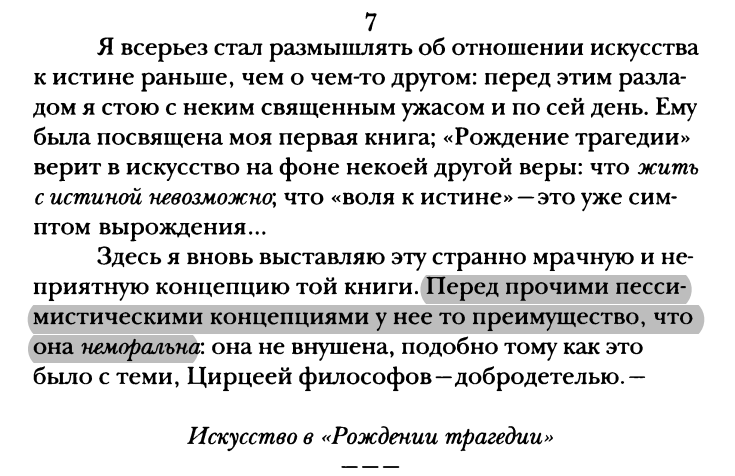 А вообще (и так уже, по-моему, всем ясно), у Ницше просто эстетическое > эпистемологического: > Über das Verhältniß der Kunst zur Wahrheit bin ich am frühesten ernst geworden: und noch jetzt stehe ich mit einem heiligen Entsetzen vor diesem Zwiespalt. Mein erstes Buch <war> ihm geweiht; die Geburt der Tragödie glaubt an die Kunst auf dem Hintergrund eines anderen Glaubens: daß es nicht möglich ist mit der Wahrheit zu leben; daß der „Wille zur Wahrheit“ bereits ein Symptom der Entartung ist…[/b] > Ich stelle die absonderlich düstere und unangenehme Conception jenes Buches hier noch einmal hin. Sie hat den Vorrang vor anderen pessimistischen Conceptionen, daß sie unmoralisch <ist>: — sie ist nicht wie diese von der Circe der Philosophen, von der Tugend, inspirirt. — То есть нахуй идёт и истина, и Платон, и вообще философия, возвращаемся к досократикам и сидим в Мюфосе. Вот и всё. Приехали, блять.