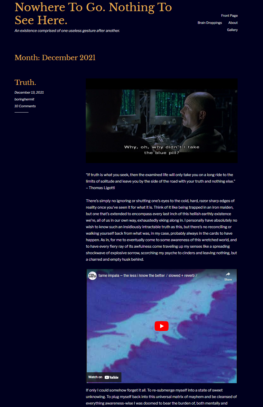 >>179248 >>У пары есть ещё двое сыновей: Брайан и Майкл я сейчас ебнусь... у бенатара антинаталиста пессимиста проморталиста есть дети... это типа нигилистический выверт в духе новых ценностей и ретерриторизации на поле моральных ценностей, выжженого радикальным пессимизмом? это пиздец, это предательство если честно. хотя с другой стороны пессимизм самоликвидируется в итоге, что даже иронично. бля может стоит запилить вам тут большой пост с мыслями о лиготти и конце пессимизма, будет интересно почитать реакцию анона