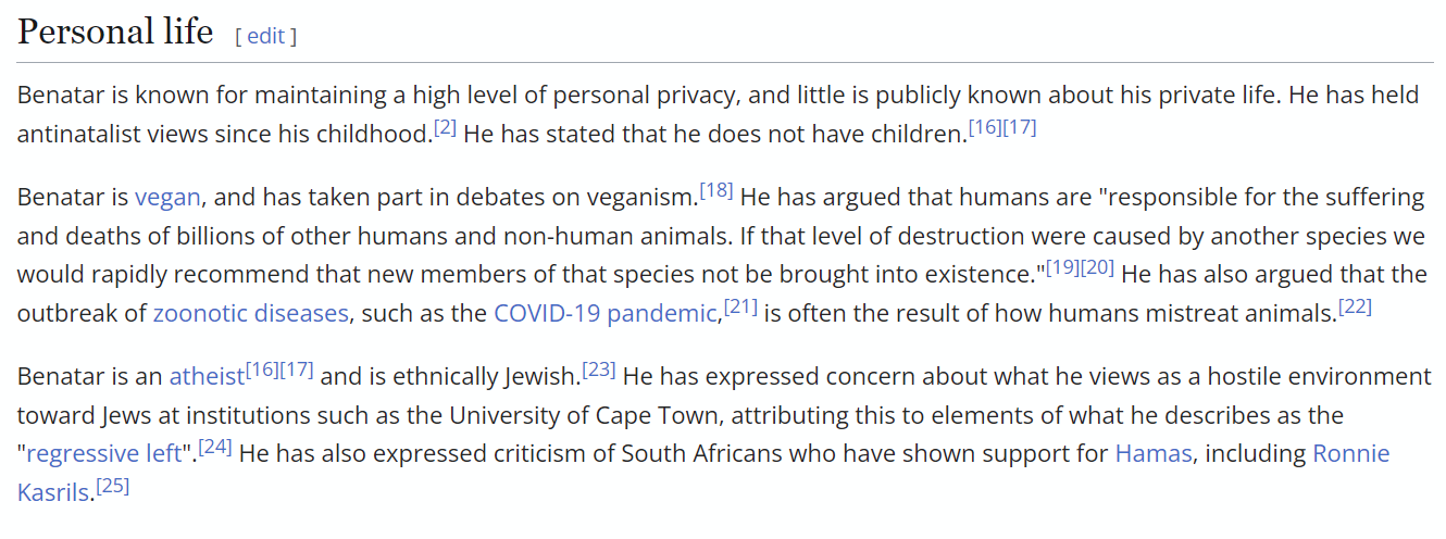> О биографии Бенатара известно очень мало, поскольку он ревностно охраняет свою личную жизнь. Бенатар — сын Эвелин Мэри Голдберг и Соломона Бенатара (вероятно, первоначально Бен-Аттар).) — эксперт по глобальному здравоохранению, основавший Центр биоэтики в Кейптаунском университете. У пары есть ещё двое сыновей: Брайан и Майкл. ОП, галку проебал