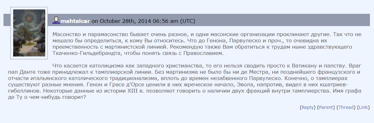 >>163424 >ИТ про метафизическое единство и тщетность бытия Вот и называйте себя метафизистами, единистами или тщетистами. А к традиции вы никакого отношения не имеете. >который выдумал какой-то там "традиционализм", определения которого не знает никто, даже он сам. Ну и зачем Генон выдумал какой-то очередной модернистский кружок и примазал его к традициям? Какие традиции своих французских предков соблюдал Генон? Какие традиции своих швейцарских предков соблюдал Шуон? Почему они считают, что перенимать традиции народов за тысячи км от них - традиционно? Такое не происходило в традиционном обществе. Почему они не учитывают СПОСОБ передачи традиции в традиционном обществе? Каков шанс, что французский француз в 1200 году (предок Генона) переймет индийские традиции и станет рассуждать про всякую кали-югу?