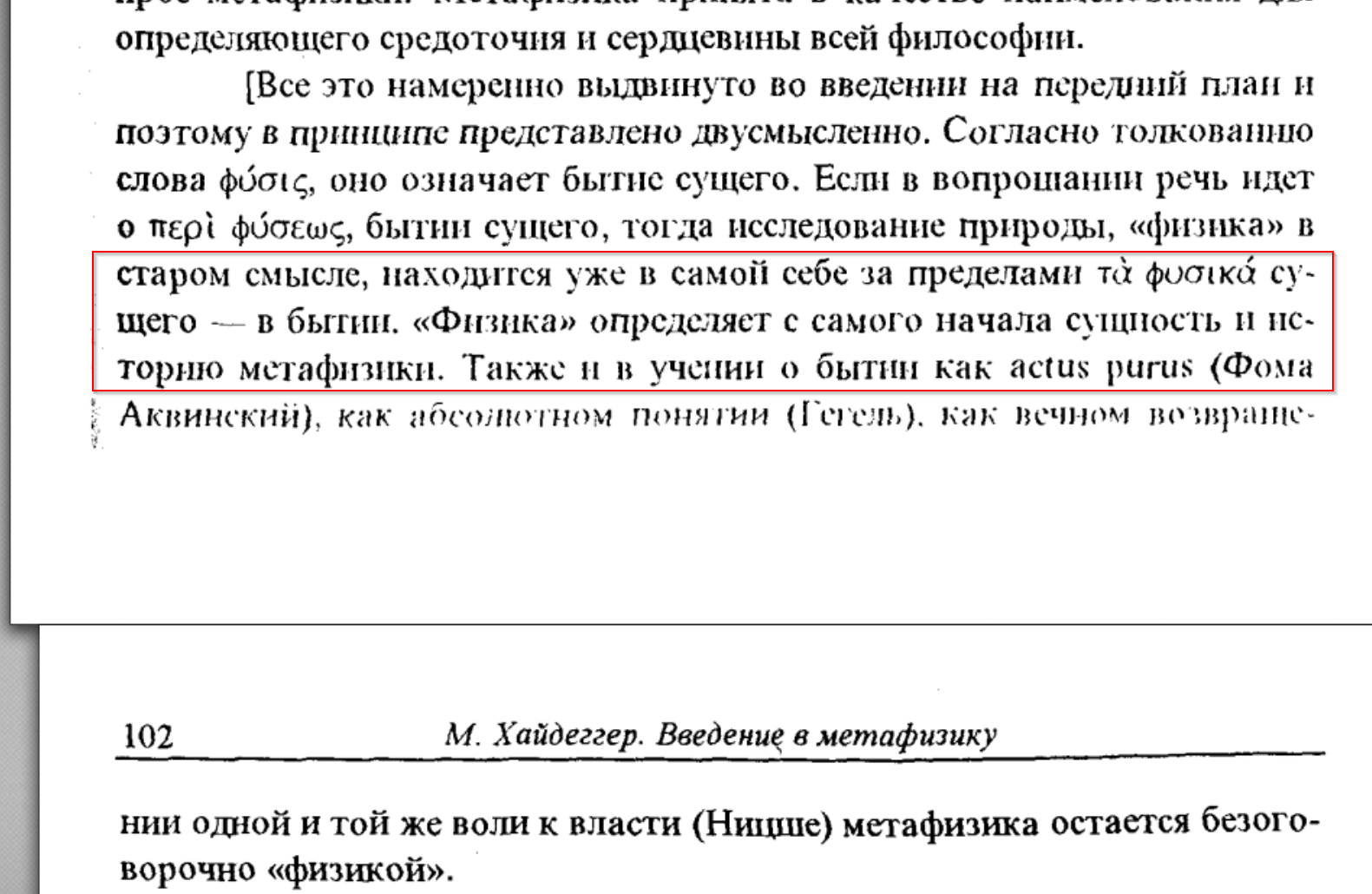 То есть в каком-то смысле разделяет метафизику (отстой) и мета-физику (класс). Физика в этой концептуализации занимается физическим, physikos (= сущим), а physis как бытие сущего находится над физическим (сущим).