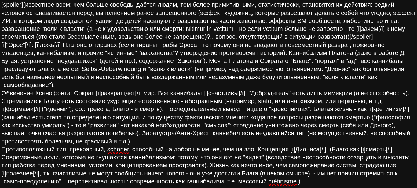 >>180177 Если ты марксист или просто гегельянец то не вижу смысла оспаривать, если нет то... тоже не вижу смысла оспаривать. Еще скажи вряд ли лучше Дугина (он же так много о ней написал и так все ловко систематизировал!) >>180178 >Сомнительное заявление. Хуже или лучше с какой точки зрения? С точки зрения понимания философии. Интерпретатор понимает (лучше всех в свое время), ты через него тоже можешь на каплю причаститься к пониманию, а если ты сам читаешь в первый раз книгу в переводе, ты причастишься к чему-то другому, не к философии этого философа, к каким-то призракам в своей голове (соответствующим уровню развития твоей головы; может даже очень умным призракам, но все еще не имеющим отношения к философу) которые у тебя будут рождаться при "чтении"