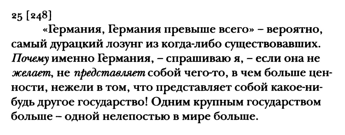>>180162 >Ницше не получал систематических знаний по философии и истории философии из первоисточников Как и большинство философов до 20 века. Ницше хорошо знал философов, которые ему нравились — Шопенгауэра, Платона, досократиков. Читал также всякие рандомные книжки, например Дюринга. В античной философии так вообще очевидно разбирался ЛУЧШЕ чем любой немецкий идеалист, может чем ЛЮБОЙ (серьезный, не филолог как Шлейермахер) ФИЛОСОФ 19 ВЕКА. Потому что полистать диалоги Платона в переводе ну это может быть даже хуже, чем внимательно проштудировать книгу крутого специалиста по Платону. Например Кант скорее знал Платона как "полиставший" (и все остальные, как в 19 веке так и в 20, о том что раньше даже не говорю).