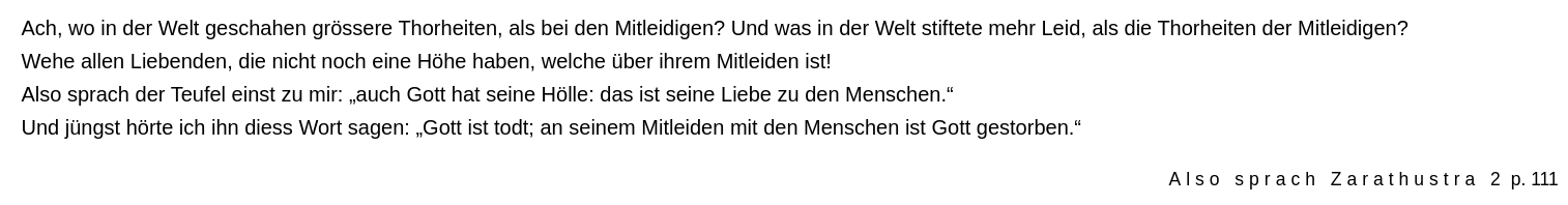 Nicht Zufriedenheit, sondern mehr Macht; nicht Friede überhaupt, sondern Krieg; nicht Tugend, sondern Tüchtigkeit (Tugend im Renaissance-Stile, virtù, moralinfreie Tugend) Die Schwachen und Missrathnen sollen zu Grunde gehn: erster Satz unsrer Menschenliebe. Und man soll ihnen noch dazu helfen. Was ist schädlicher als irgend ein Laster? — Das Mitleiden der That mit allen Missrathnen und Schwachen — das Christenthum…