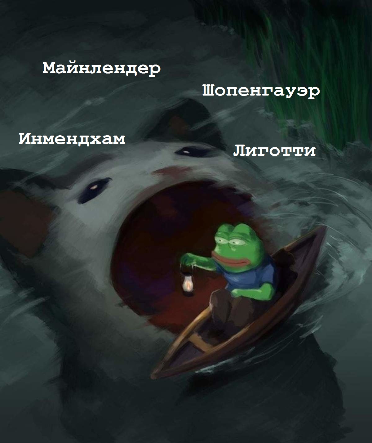 >>180357 >страха перед истиной Интересный момент, что Ницше с самого начала своего пути стартует с того, что ему мол известна истина (это от Шопенгауэра), и в конце (почти) не сходит с этого. Человек настолько силен, насколько он может выдержать истину. А с какого перепугу человеку известна истина? Муравью известна "истина"? Шимпанзе известна "истина"? Человеку палеолита известна "истина"? Обывателю известна "истина"? Путину / современному главмасону Запада известна "истина"? Будто бы надо только в ней "признаться" (и Ницше, конечно, признался, и гарцует своей пропитанностью истиной), а в том чтобы узнать никакой проблемы нет. Только ученые и самые думающие философы (Сократ) не знают ничего, зато эзотеричка тетя Марина проникла в глубины своего духа и всю истину о живом и космосе узнала.