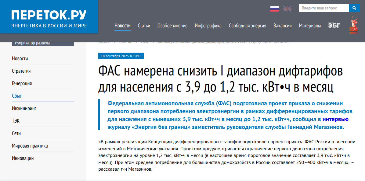 «В рамках реализации Концепции дифференцированных тарифов подготовлен проект приказа ФАС России о внесении изменений в Методические указания. Проектом предусматривается ограничение первого диапазона потребления электроэнергии на уровне 1,2 тыс. кВт•ч в месяц (в настоящее время пороговое значение составляет 3,9 тыс. кВт•ч в месяц). При этом среднее потребление для большинства домохозяйств в России составляет 250–400 кВт•ч в месяц», – рассказал г-н Магазинов.