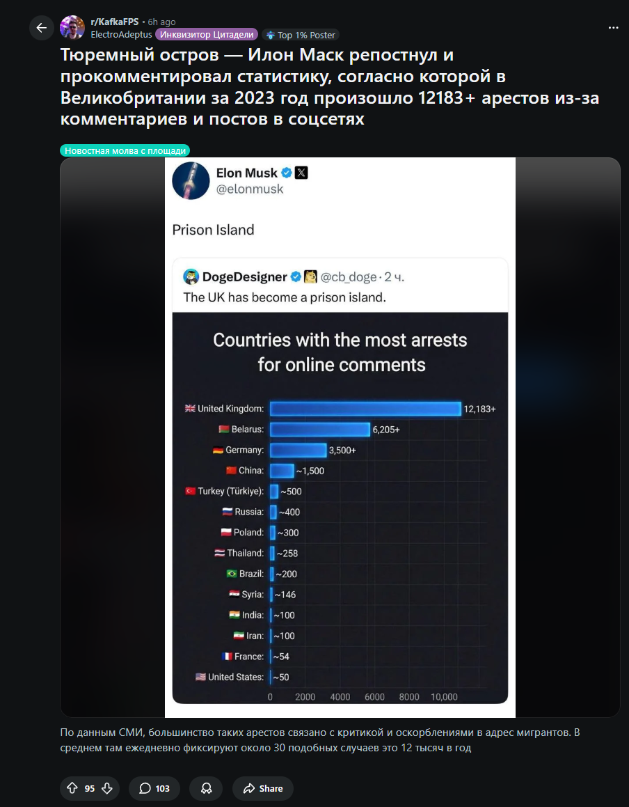 Вот например текст заседания парламента Британии, в котором говорится та же самая цифра: >В среднем ежедневно арестовывается 30 человек. В 2014 году, при коалиционном правительстве, было введено так называемое "не связанное с преступлениями правонарушение на почве ненависти" - произнесение слов, которые сами по себе еще не являются уголовно наказуемыми, но которые полиция, тем не менее, должна официально фиксировать и применять против людей. С 2014 года было зарегистрировано более 133 000 таких инцидентов, то есть более 13 000 в год. >Цифры по арестам говорят сами за себя. Как мы уже слышали, ежегодно производится 12 000 арестов, что на 58% больше, чем в 2019 году. https://hansard.parliament.uk/lords/2025-07-17/debates/F807CB70-D90D-4A19-9433-99539B7CF21F/OnlineCommunicationOffenceArrests