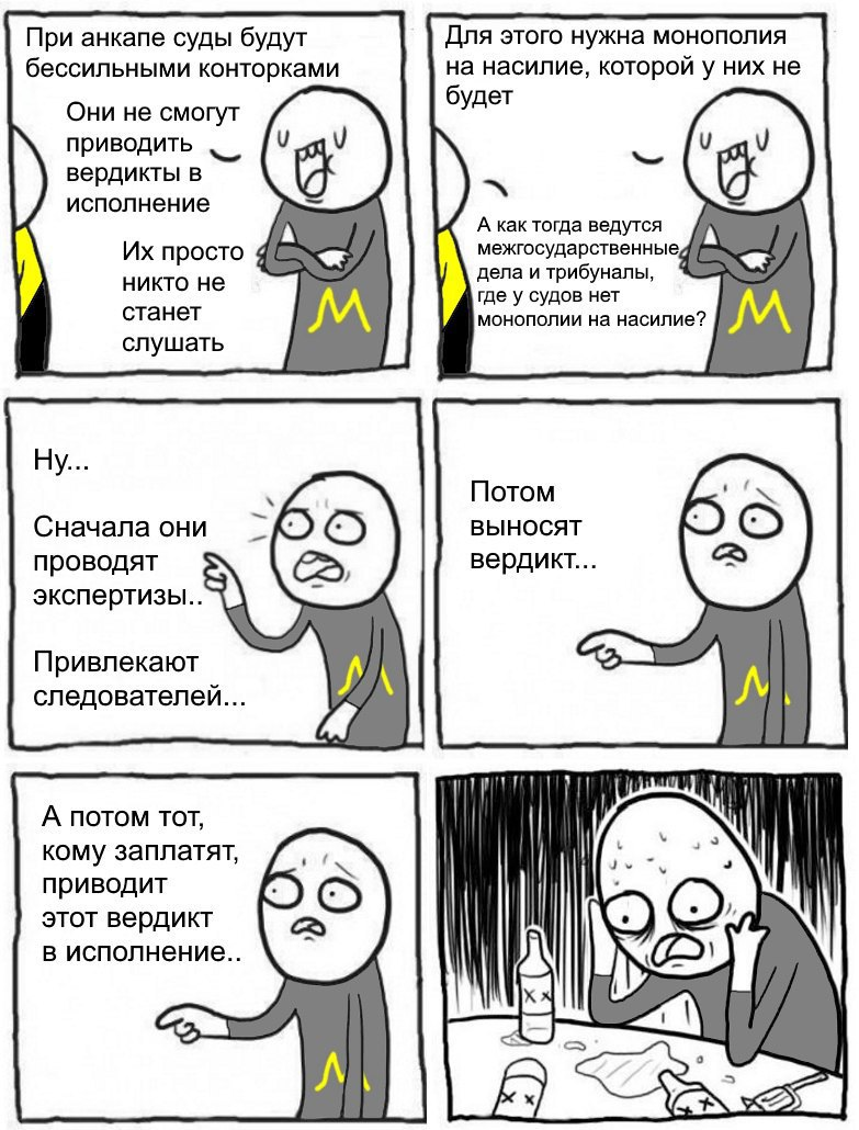 Сейчас этот знакомый коммуняка судится с гойсдуратсвом, чтобы получить деньги на лечение. (Как думете? Отсудит что-нибудь?) Такие дела. А вы уще жалуетесь на суды при анкапе
