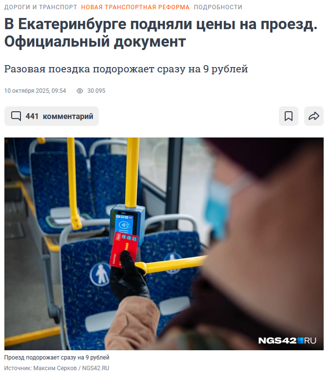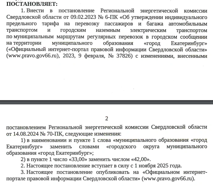 В документе, размещенном на официальном портале правовой информации региона, сказано, что вместо 33 рублей билеты на автобусы, трамваи и троллейбусы в Екатеринбурге станут стоить 42 рубля. Изменения вступят в силу с 1 ноября 2025 года.