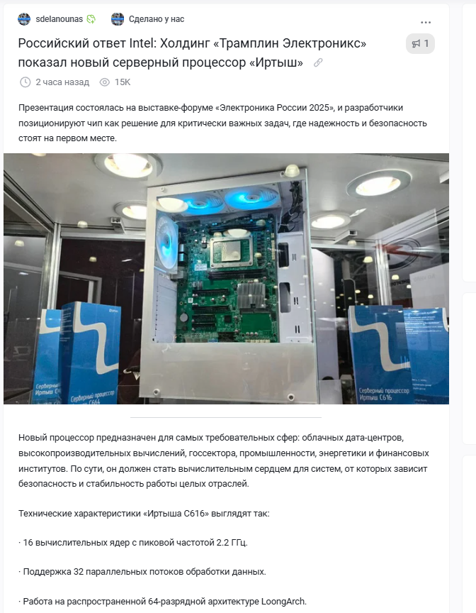 При этом «Иртыш» — это не единичная модель, а целое семейство. В перспективе пользователям будут доступны конфигурации с 32 и 64 ядрами, поддерживающие до 1 ТБ оперативной памяти. По заявлению производителя, по производительности новинка сопоставима с известными зарубежными серверами — процессорами Intel Xeon Silver 4314 и AMD на архитектуре Zen 3.