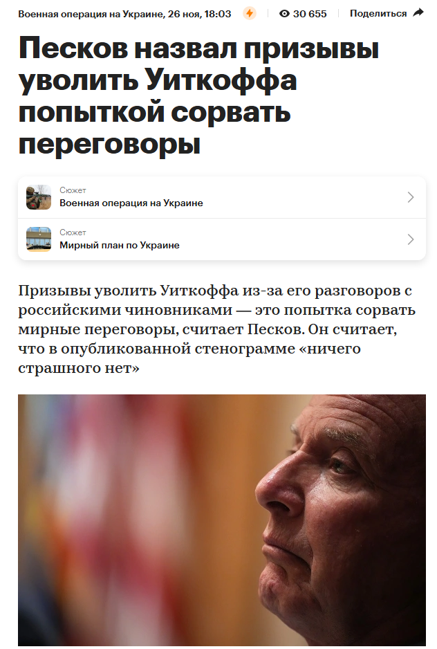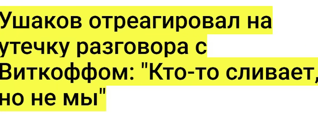 — Информагентство Bloomberg публиковало стенограммы якобы телефонных разговоров Уиткоффа, Ушакова и Дмитриева. Но Ушаков расшифровки опроверг и заявил, что все звонки проходят по закрытым каналам связи.