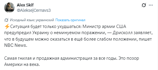 — Министр армии США Дэниел Дрисколл посетил Киев, где заявил, что у Украины нет шансов на победу.