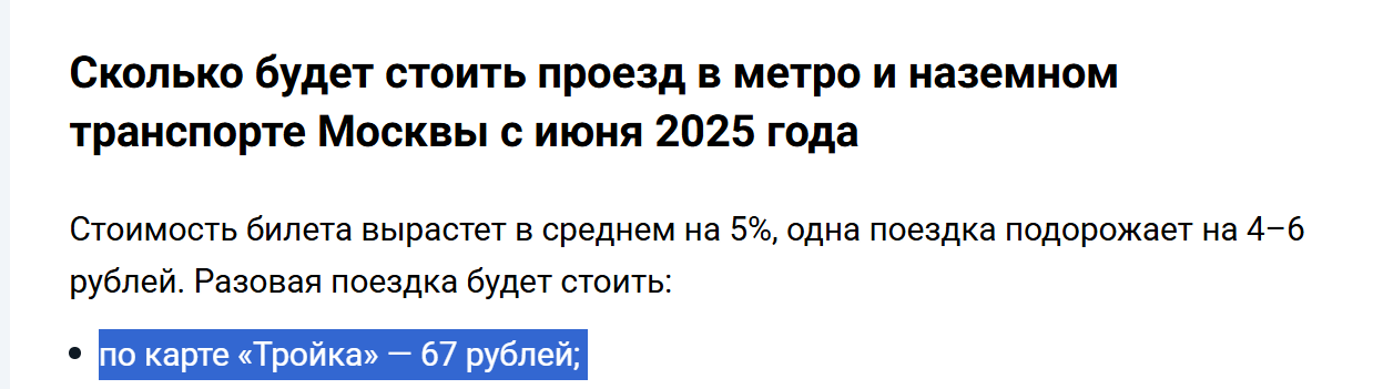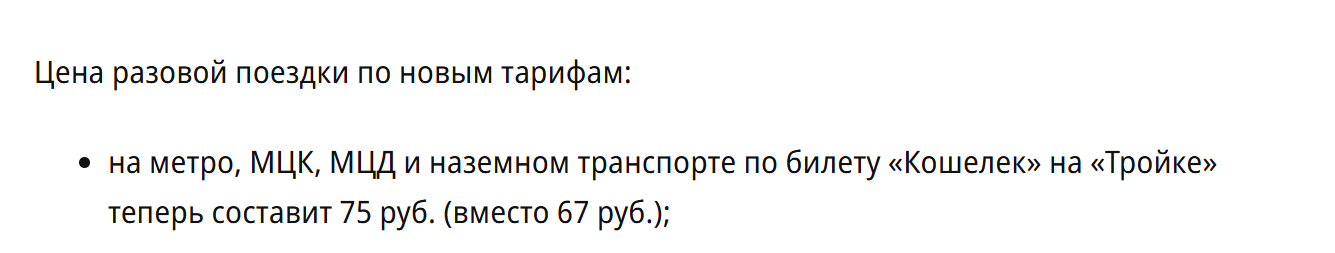 Единые проездные билеты, записанные на карту «Тройка», также изменятся. Безлимитный билет на сутки будет стоить 415 руб. вместо нынешних 375, на трое суток — 800 вместо 720, на 30 дней — 3460 (вместо 3160), на 90 дней — 8450 (вместо 7650). Стоимость годового проездного составит 24 900 руб. вместо 22 650.