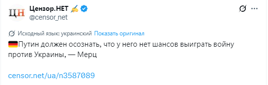 >>61295570 >«Путин должен осознать, что у него нет шансов выиграть эту войну за счет европейского порядка, свободы и мира», — заявил канцлер Германии Фридрих Мерц. Об этом пишет The Guardian.