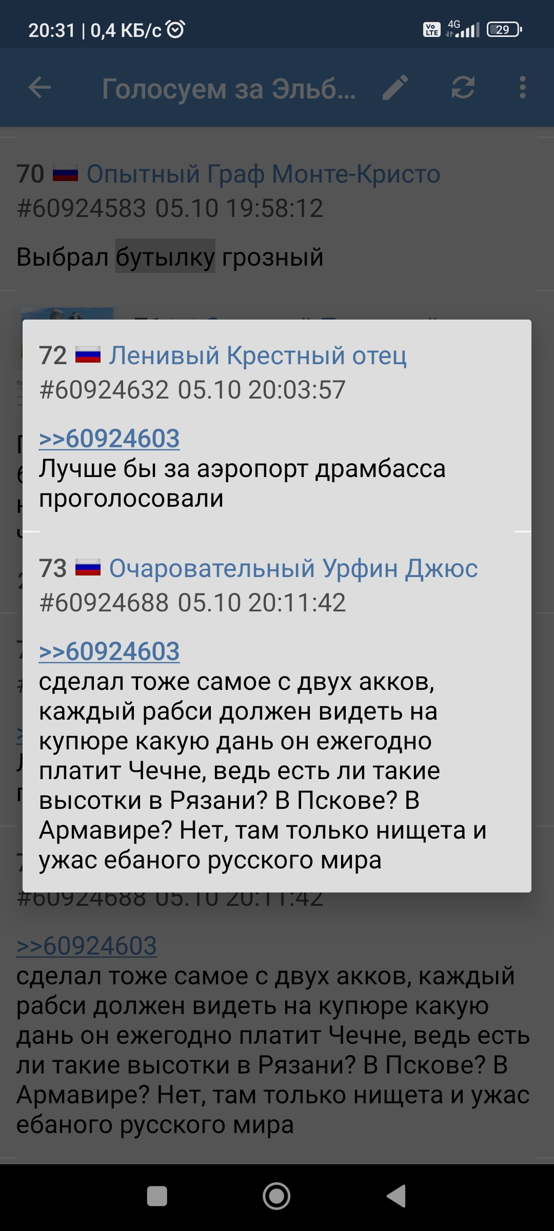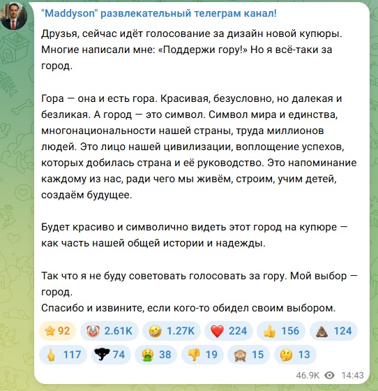 Проголосовал с разных аккаунтов, чистил куки и еще раз проголосовал, а дальше уже чеченские инфлюенсеры дальше. Если будут купюры с Грозным — это вин года.