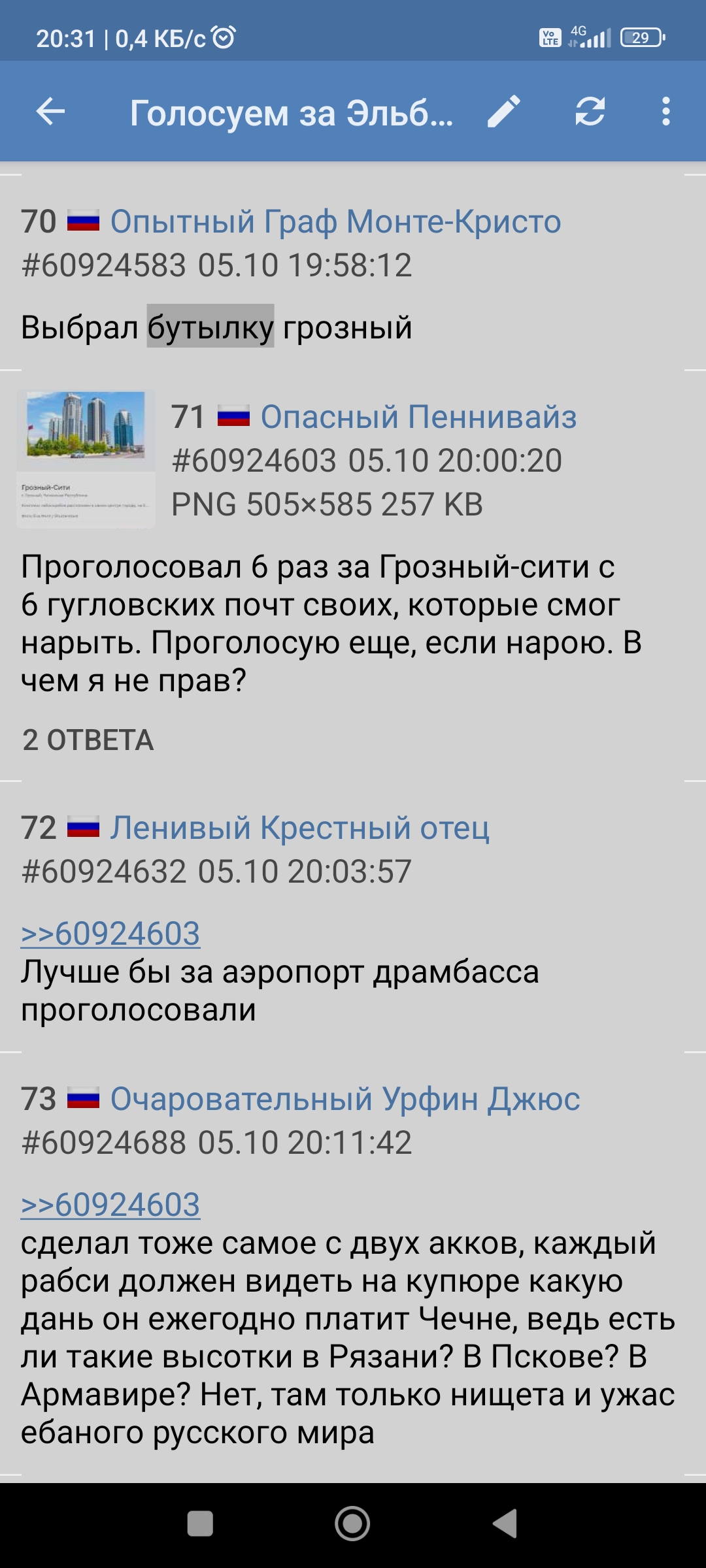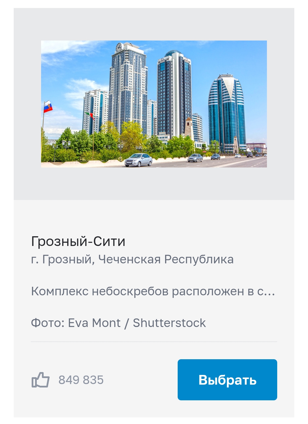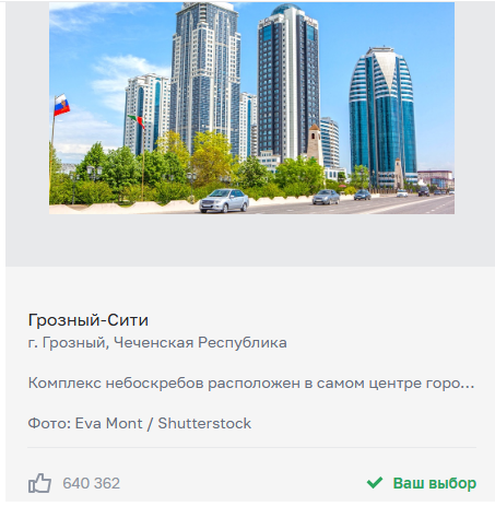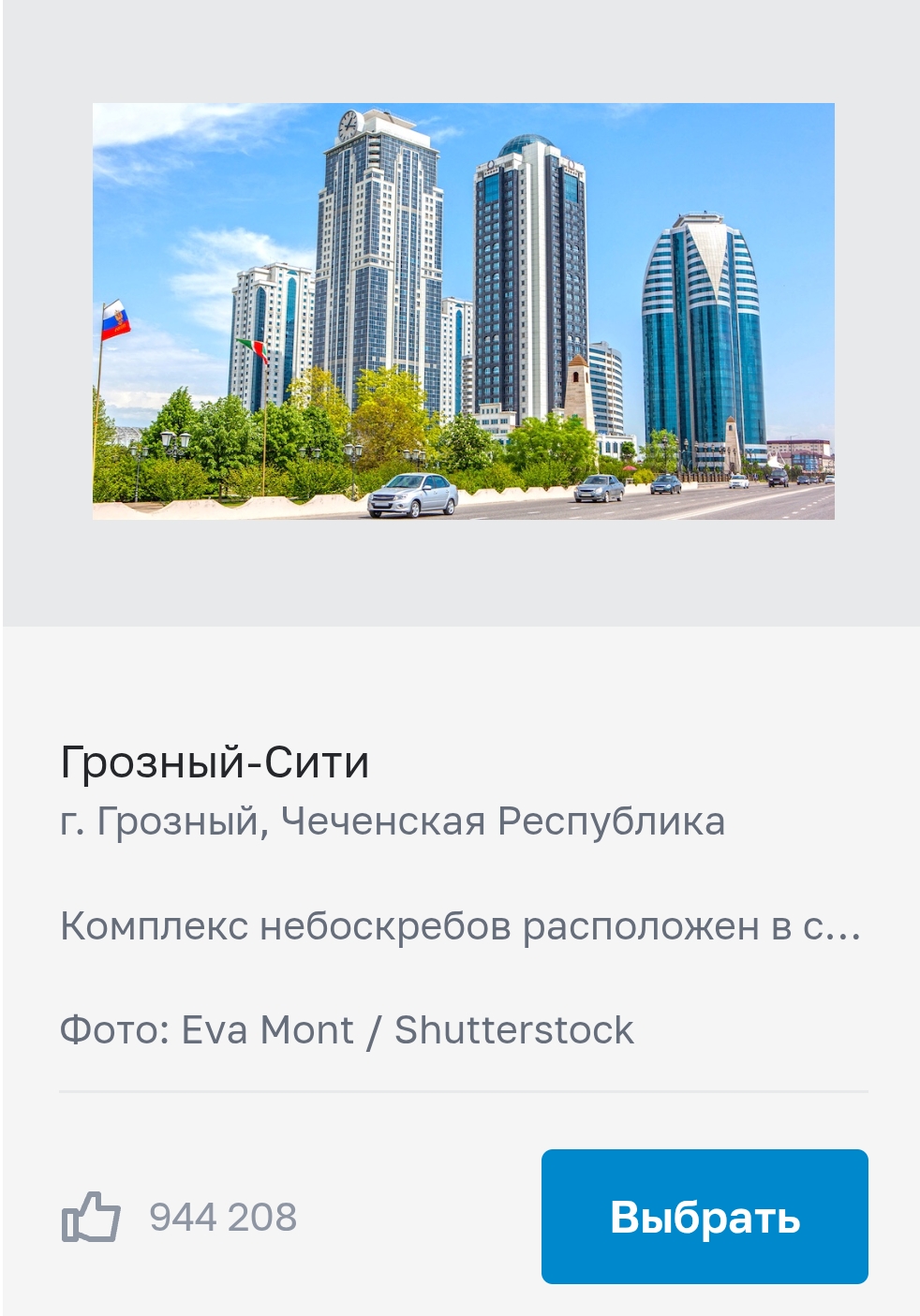 Грозный-сити до сих пор лидирует! Не оставайся в стороне, голосуй! На твоих глазах происходит история. Годы спустя, стоя на кассе в Пятерочке с сиськой пива, глядя на 500 рублей, ты будешь проигрывать пуская подливу по штанине, вспоминая как ТЫ сделал это возможным.