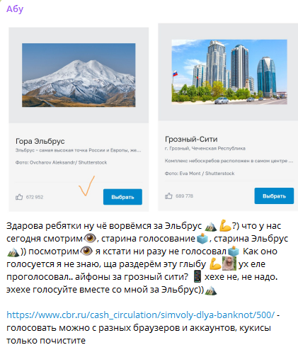 Соберитесь, проголосуйте за Эльбрус! Я уже подключил всех родственников. Но чеченцы накручивают ботами по ночам. Не сдавайтесь! Нельзя допустить, чтобы купюра превращалась в рекламный стикер коммерческой недвижимости г. Грозного.