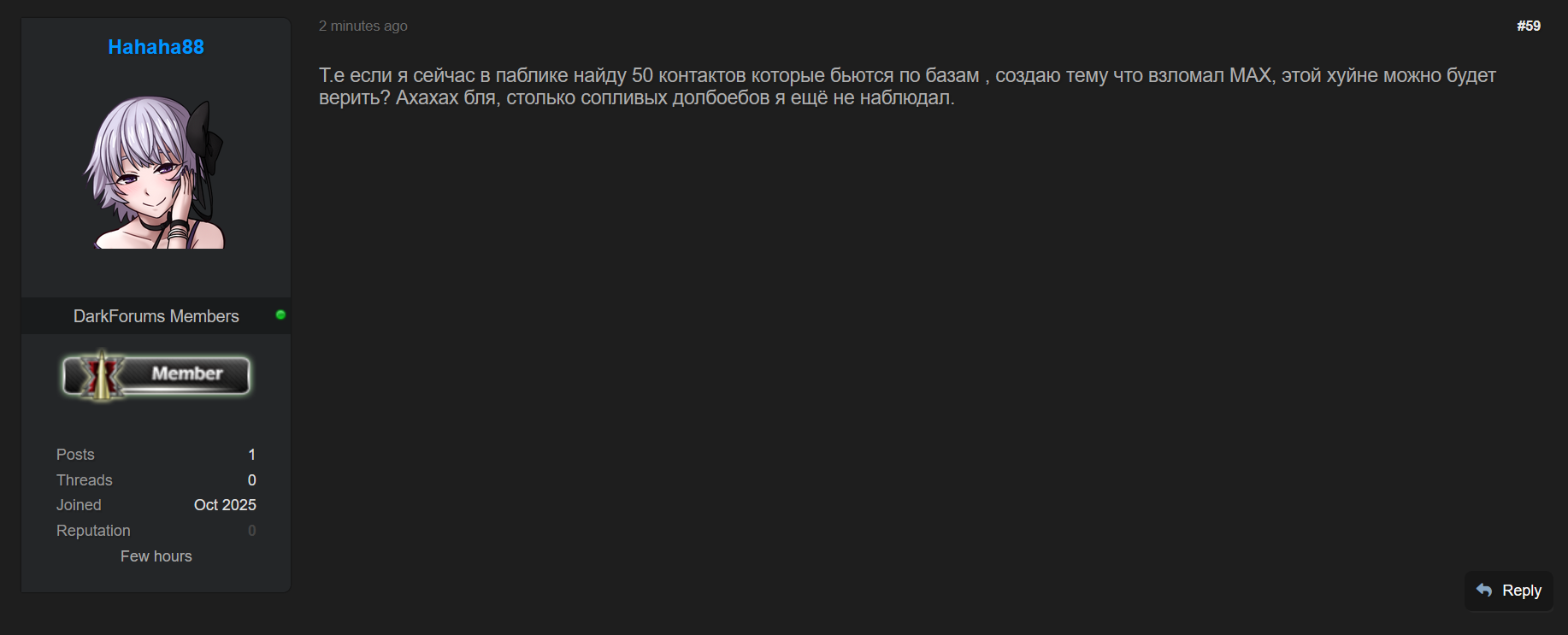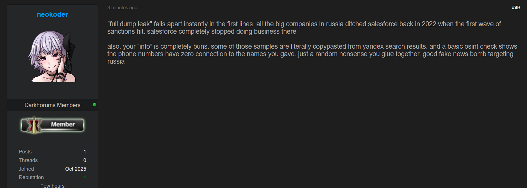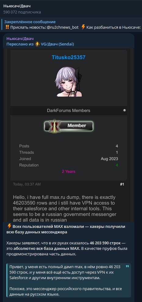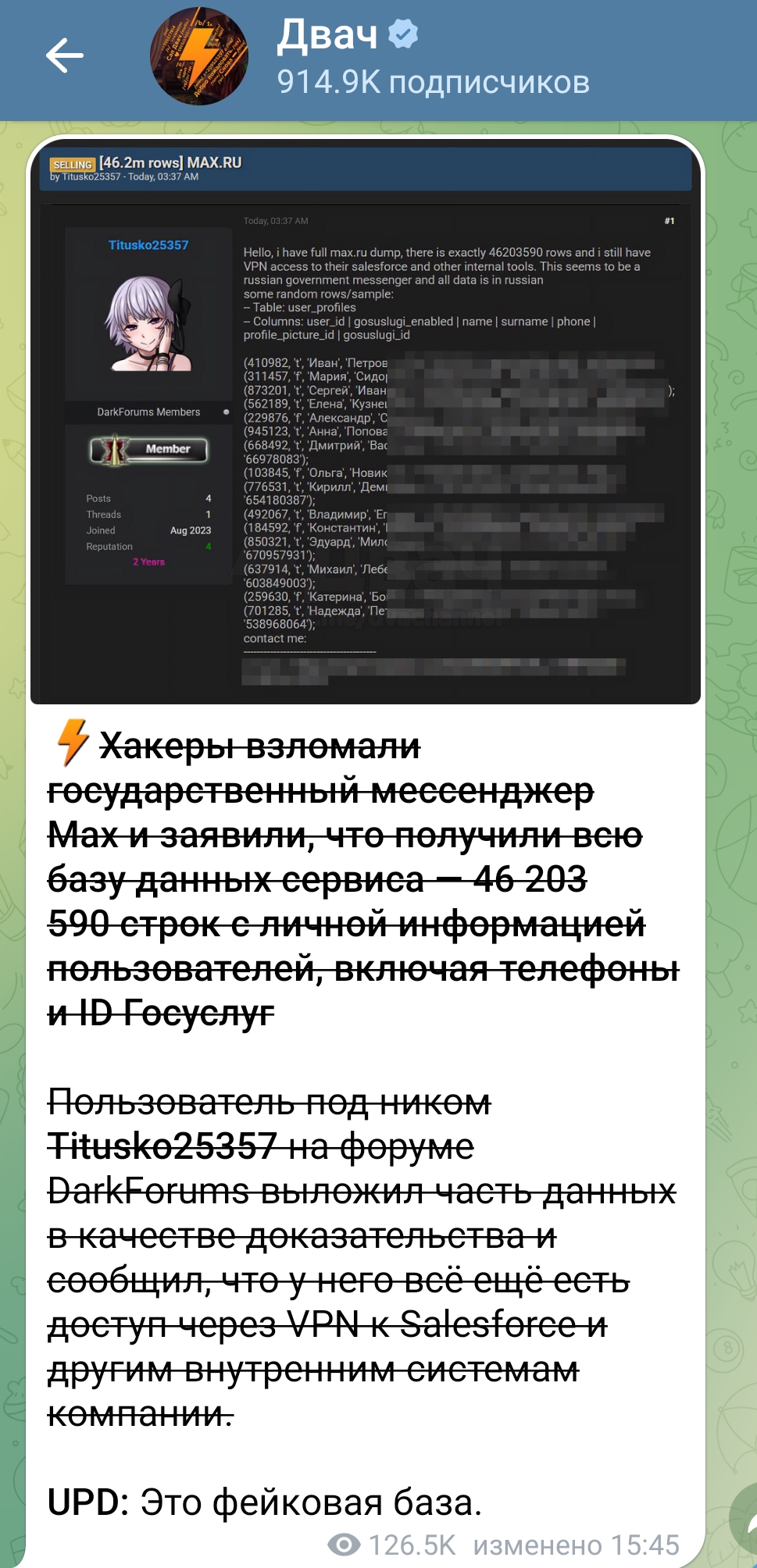 По телеге разнеслись сообщения о том, что данные пользователей слиты и базу можно купить в даркнете, но это не так. Авторы постов ссылаются на доступ к программному обеспечению Salesforce, но мессенджер его никогда не использовал. Кроме того, новость рассылали с анонимных аккаунтов, которые зарегали буквально вчера.