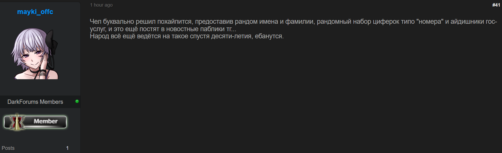 >>61023971 >Что по Гойуслугам? А что, ID Гойуслуг в свободном доступе? Или фэйкер не смог взять ВСЕ данные из условной утечки Яндекс.Еды, чтобы 15 записей бились? Или сложно догадаться, что потенциальный покупатель сможет запросить заведомо известный ему номер?