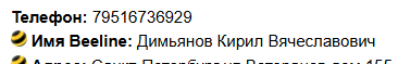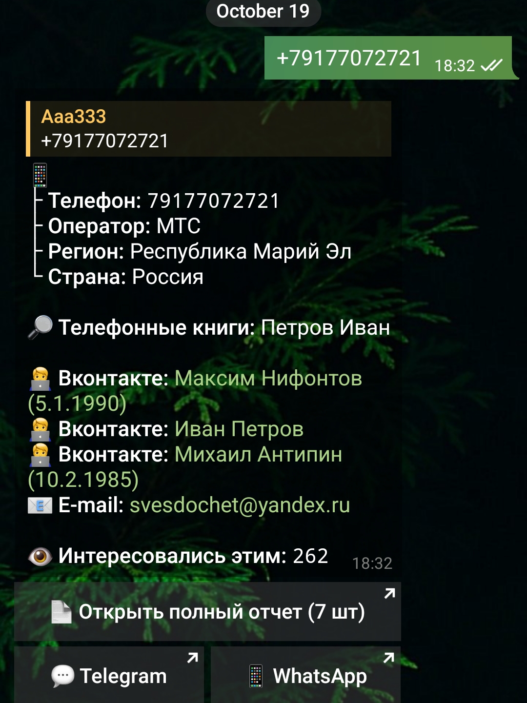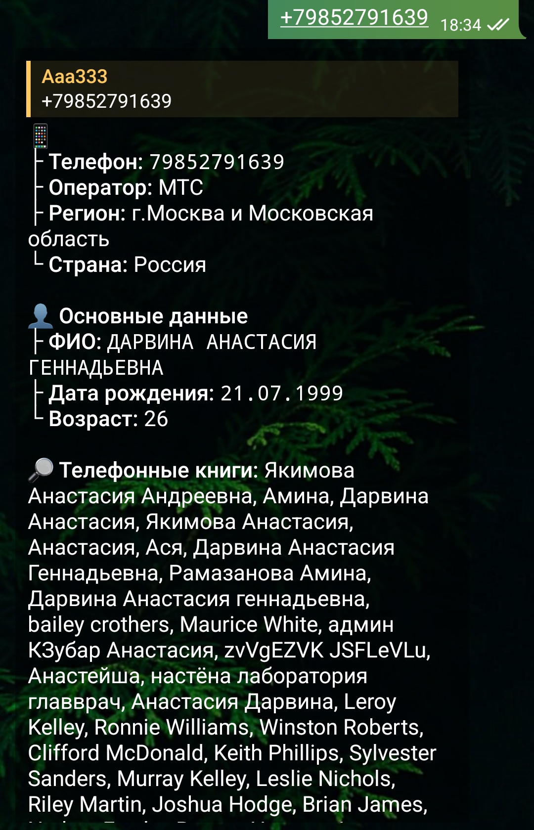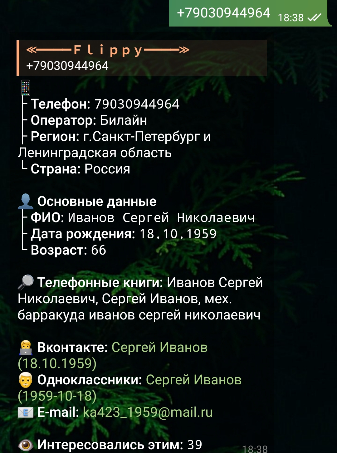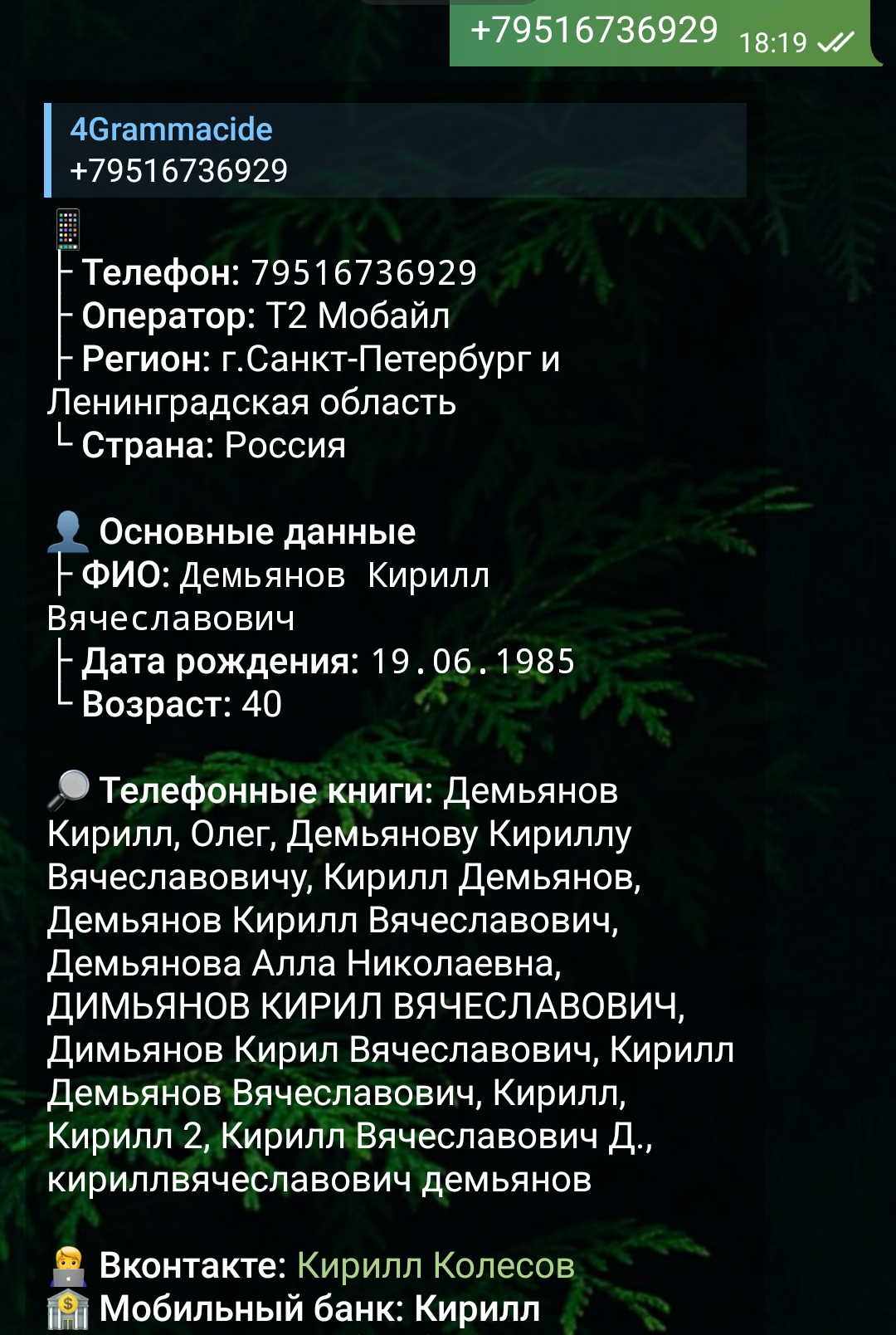 >>61022577 Ну тут всё индивидуально. По каким-то номерам минимальное количество инфы. Буквально как у кого записан, страничка на вбыдлятню, адрес электронной почты и всё. Мне вот например так повезло А каким-то везёт меньше. По номеру телефона буквально всё выдаётся с паспортными данными. Зависит от того, как часто и где свой номер шкварил.