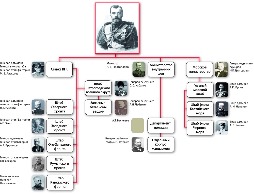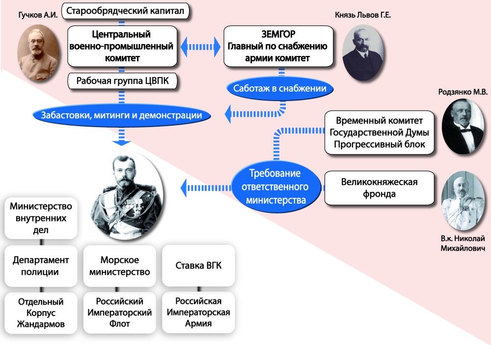 Непосредственно блокаду поставок хлеба организовал член Инженерного совета Министерства путей сообщения Ломоносов, захвативший 28 февраля вместе с Комиссаром временного комитета Госдумы Бубликовым Министерство путей сообщения. Он же стал счастливым обладателем оригинала Манифеста об отречении. Правда куда сей документ эпохи запропал из шаловливых рук не совсем понятно, ибо на хранение в Сенат "подлинник" был принят только 31 июля 1917 года. Когда вопрос с царской семьей был решен окончательно. Сам счастливый обладатель, как водится, через десять лет сдрыснул в Лондон, предварительно нагрев родную советскую власть на паровозной афере. ИсточниковедЕние, да. Будем считать, что в общих чертах среду возможного "агрессивного меньшинства" определили. Теперь о тех, кто мог/должен был в него стрелять. Ибо защитники Отечества на пулемёты ложатся, как правило, не столько по зову сердца, сколько по приказу. На схемке состав сил "опоры Престола".