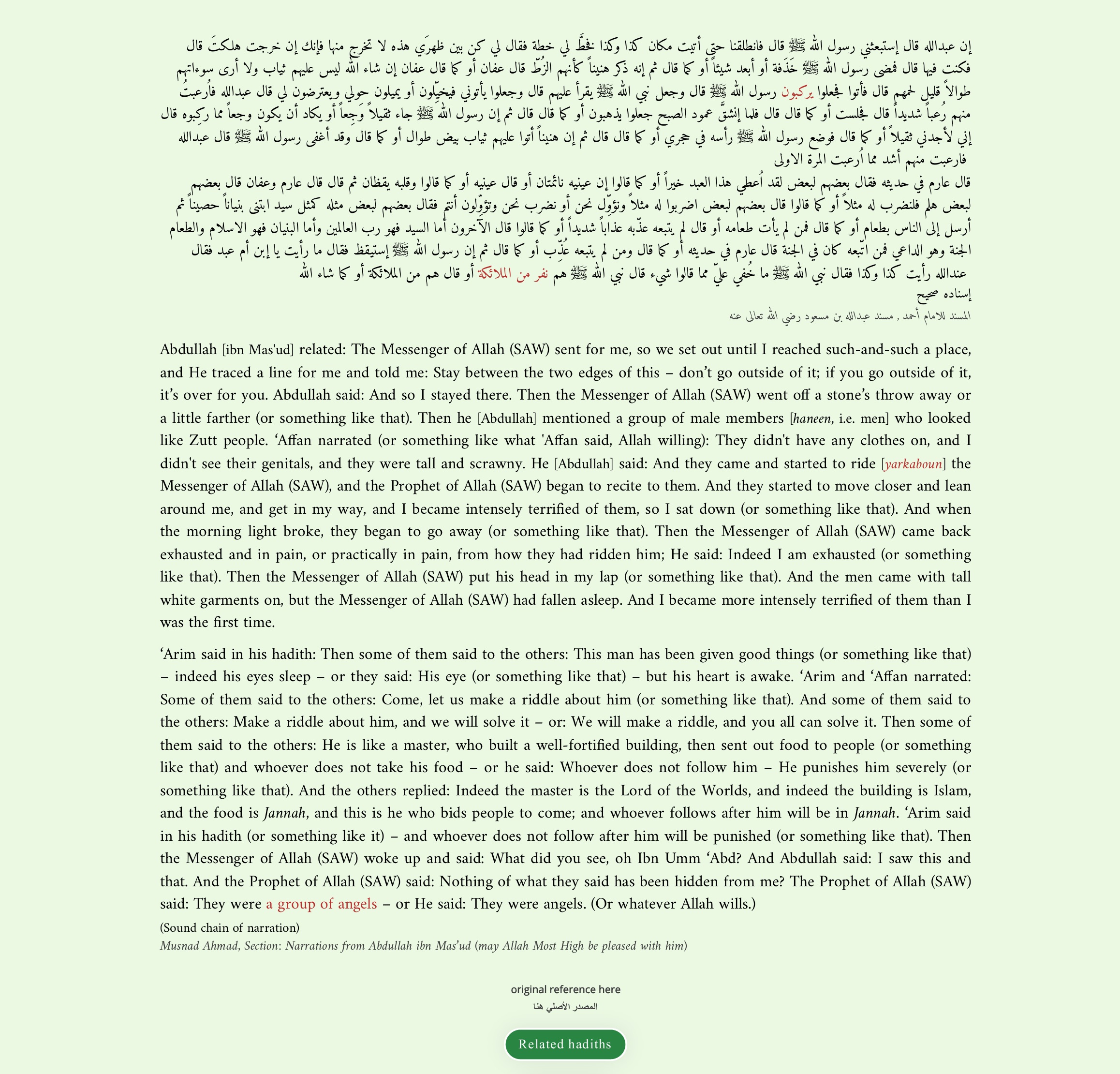 Абдулла передал: «Посланник Аллаха (мир ему и благословение Аллаха) послал за мной, и мы отправились в путь, пока я не достиг такого-то места. Он провёл для меня линию и сказал: «Стой между двумя краями этого места – не выходи за него; если выйдешь за него, тебе конец». Абдулла сказал: «И я остался там». Затем Посланник Аллаха (мир ему и благословение Аллаха) отошёл на расстояние броска камня или чуть дальше. Затем он [передатчик] упомянул группу мужчин [ханин, т.е. мужчин], которые выглядели как люди из племени Зутт, как сказал Аффан, если Аллах позволит, без одежды (но я не видел их гениталий), высокие и худые. И они приехали и стали ездить верхом [яркабун] на Посланнике Аллаха (мир ему и благословение Аллаха), и Пророк Аллаха (мир ему и благословение Аллаха) начал читать им Коран. И они стали приближаться, обходить меня стороной и мешать мне, и я очень испугался их, поэтому сел. И когда рассвело, они начали уходить. Затем Посланник Аллаха (мир ему и благословение Аллаха) вернулся измученный и страдающий от боли, или почти от боли, от того, как они на нем ехали. Он сказал: «Поистине, я измучен». Затем Посланник Аллаха (мир ему и благословение Аллаха) положил свою голову мне на колени. И пришли худые, в высоких белых одеждах, но Посланник Аллаха (мир ему и благословение Аллаха) спал. И я испугался их еще сильнее, чем в первый раз. …
