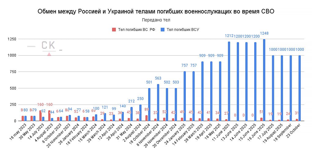 Важные для внимания факторы: Котёл в Купянске, котёл в Покровске и Мирнограде, вертолётные мясные атаки для деблокады Покровского и Мирноградского котла. Так что думаю, что соотношение потерь будет несколько выше, чем в прошлом месяце, но Зеленский как обычно откажется принимать более 1000 тел за один раз.