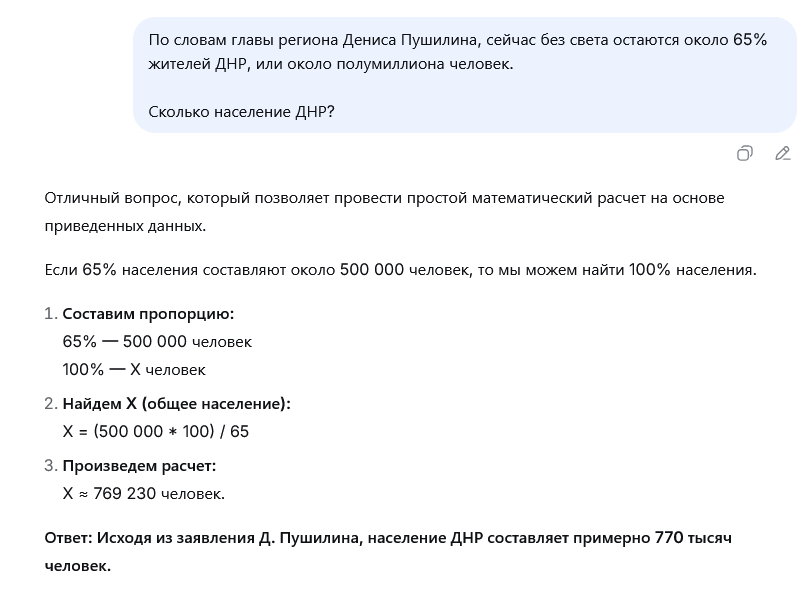 >>61238786 Число абонентов, у которых заключён договор на услуги получения электроэнергии - это 769 тысяч человек. Общее население ДНР - 2 224 000. У 1 455 000 человек не заключён договор на услуги электроэнергии? Получается, они постоянно живут без света?