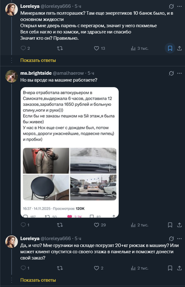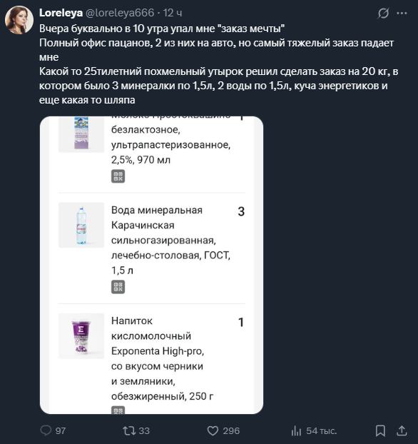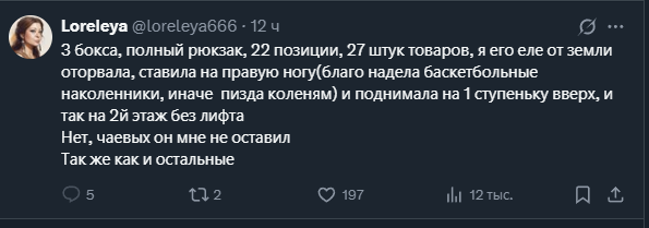 Вот у меня на днях ситуация была. Почти во всем городе отключили воду. Должны были на паре улиц, из-за аварии, но в итоге какого-то хуя без воды остался весь город. Пришлось заказывать, к тому же там скидка была. Набрал товаров, вышло 14кг, считая 5кг бутылку с водой. Думал две взять, но пожалел чела, так как магазин на другом конце города. Привёз, вроде не ныл, всё нормально. Какие заказы должны быть, чтобы такие девочки не плакали? По 200 грамм? Пачку печенюшек себе купить? Некоторые просто на неделю закупаются, там и по 20-25кг выйти может. Нахуй идти в курьеры если таскать такое не хочешь