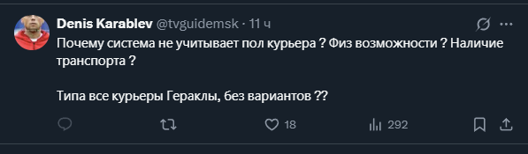 >>61238183 Каждый заказ известно какой вес имеетю Влпрос легко решается: в пидорочке тебе больше 30кг никто не повезёт, а по-хорошему надо сделать гибкую тарификацию в зависимости от веса заказа и расстояния до клиента, считая наличие или отсутствие лифта. Это легко делать и вся эта информация и так есть в базе, но вот только курьер должен в идеале вообще бесплатно возить баулы по мнению кабана и клиента. Если б я работал курой, то брал бы при таком раскладе только тяжелые заказы - меньше телодвижений, а ставка выше. Доходяги и бабы не конкуренты грузчикам типа меня. Если б за стандартыне 160 часов в месяц если б выходилл хотя бы 60-70к чистыми, то я бы дропнуд завод, но это никому не надо, а потому зарплаты у курьеров всегда будут смешные, а работать там будут всегда те, кто ведётся на маркетинг и готов работать вне рамок ТК.