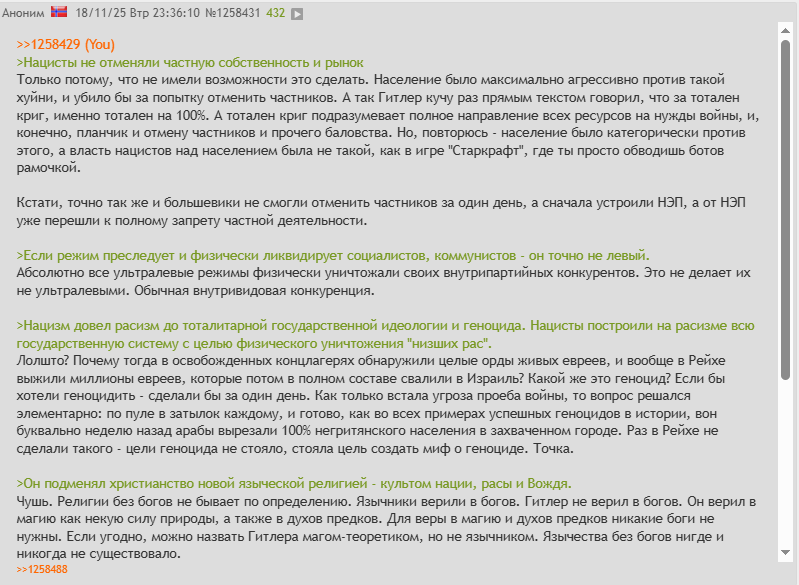 >>61241510 (OP) Тут уже сотню раз повторяли по этому поводу. Но давай еще раз. 1. Можно называть черное белым сколько угодно, суть вещей от этого не изменится. 2. Левое и правое - это конвенциональные понятия, они имеют смысл не сами по себе, а применительно к политической ситуации и обстоятельствам, повестке. 3. Применительно к ситуации 30-ых, 40-ых годов Гитлер не был левым. Ему была органично чужда идея всеобщего равенства и братства. Для коммунистов, социалистов и соцдемов наоборот. Именно поэтому между национал-социалистами и коммунистами возникли трения. Гитлер прямо топил за превосходство немецкой нации над всеми другими нациями. 4. Чисто экономические вопросы на самом деле в той ситуации занимали подчиненное положение. Все страны готовились к войне, экономика была военной во всех странах: и у СССР, и у Германии, и у США. Были какие-то региональные различия, но в целом все экономики были мобилизационными, производство и торговля контролировались, где-то жестко, где-то очень жестко, где-то чуть либеральней. 5. Теперь откуда вообще исходит идея сравнивать коммунизм и нацизм. Идея исходит от либеральной публики и почитателей свободного рынка, сформированного уже после второй мировой войны. С точки зрения этих товарищей любое ограничение частной собственности - это ужасная ересь, которая ведет к рабству.
