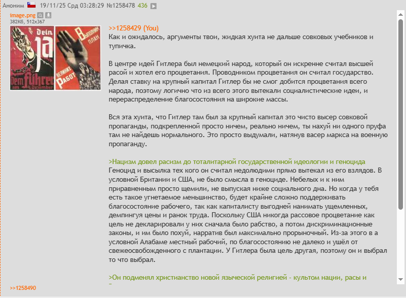 >>61242769 Нет, Гитлер полностью отрицал возможность полной утопии на Земле как конечную цель. Тем самым его теорию нельзя свести к всеполному идеалу, Гитлер признает жестокость и неидеальность мира со смирением, а не с желанием это изменить. Он ставит идеал немцев выше всего остального. Значит он не коммунист, значит не левый, и всячески мешает - значит ультраправый. Маркс же говорил: пусть капиталисты будут не рады, но ради конечного блага всех капиталистам нужно будет уступить рабочим дорогу. Маркс поддерживал идеал бесконечно развивающихся - т.е неких неполноценных людей, которые постоянно развивают общество к абсолютному идеалу, абсолютной утопии. Маркс нигде не требовал уничтожать другие народы чтобы избавиться от убогих. Маркс требовал всяческий развивающийся движ, и если убогие готовы развивать социализм, то Маркс бы и их поддерживал, о чем писал Энгельс "и если мы закуколдимся, а русские рабочие будут бунтовать и идти к прогрессу, то я за русских".