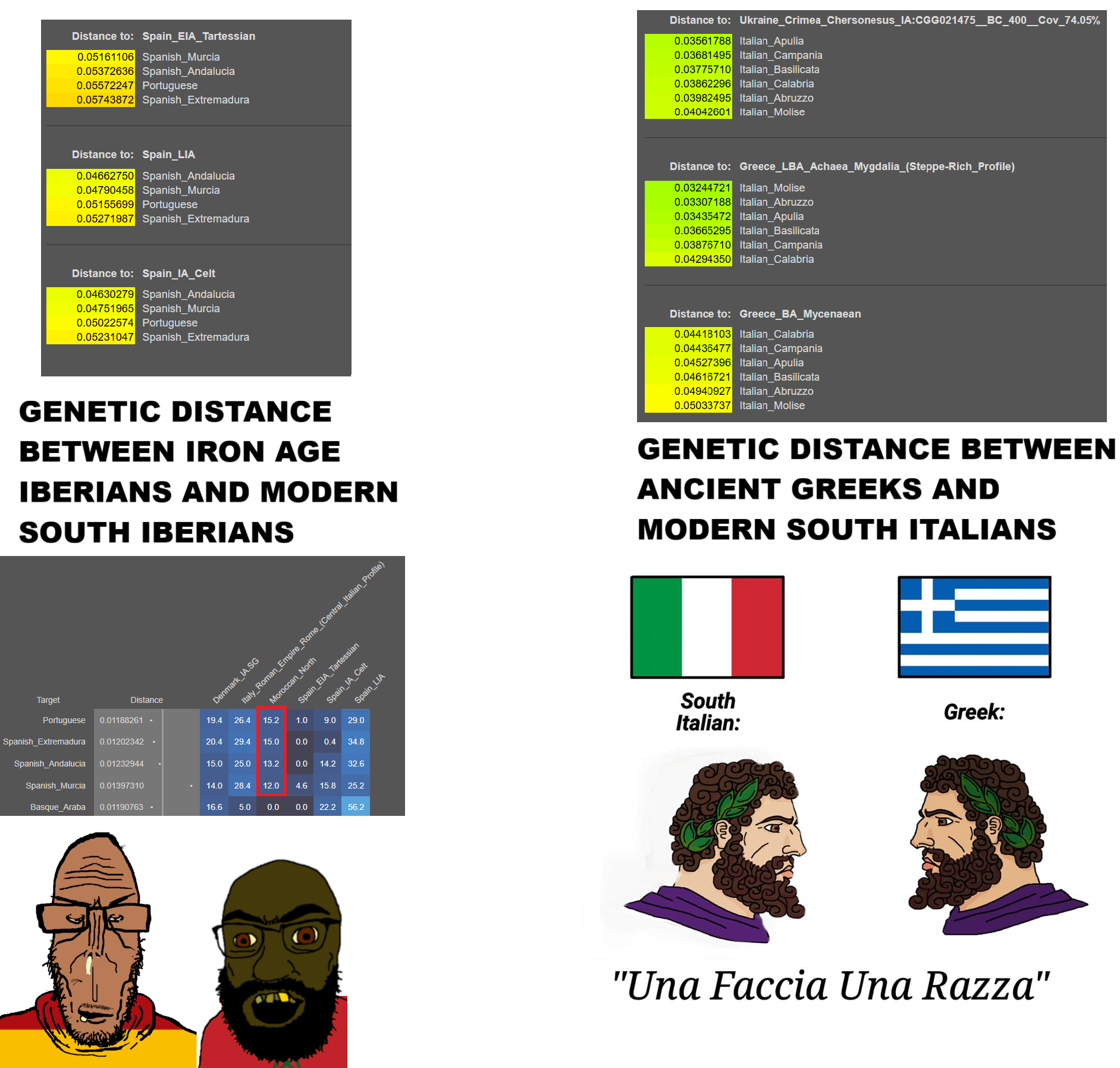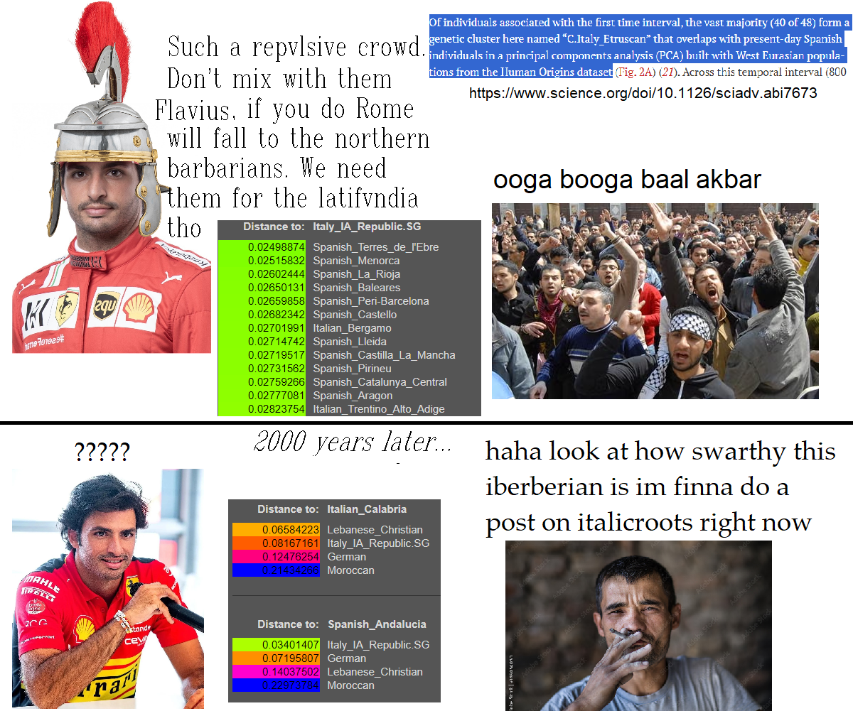 >>61280584 Да картинка рофельная, на форче испанцы и итальянцы постоянно срутся кто из них больше римлянин. На деле древние италики были ближе всего к испанцам, а имперские образцы это уже греческие мигранты по большей части. Итальянцы помесь тех и других.