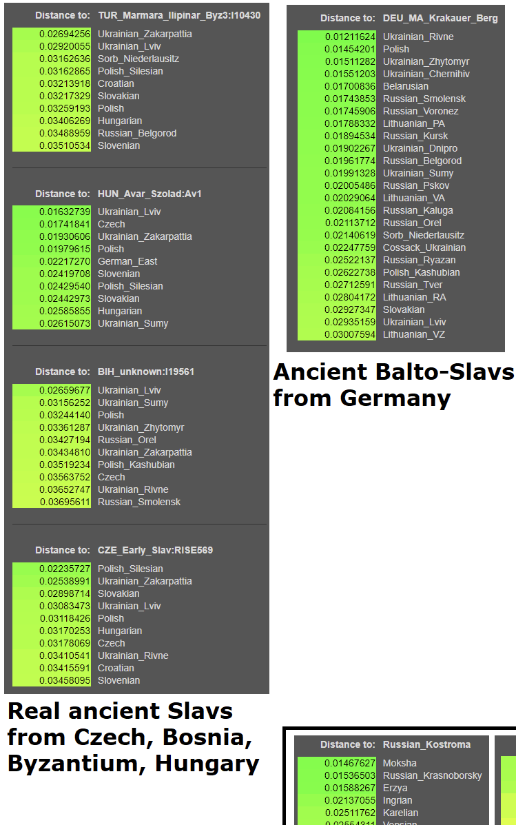 >>61289327 Ну вот если брать образцы с аварского каганата, чехии (прага-корчак?) - то русские не похожи на них и не имеют к ним никакого отношения, также как и к чехам или словакам, хохлам из львива довольно дальняя ген. дистанция, другой антротип. Зато русские похожи на латышей и литовцев, и генетически, и фенотипически. Поэтому я и говорю, что эти рандомно натыканные дилетантами миксы показывают 80% схожесть со славянами у русских и 15% балтами - туфа собачья.