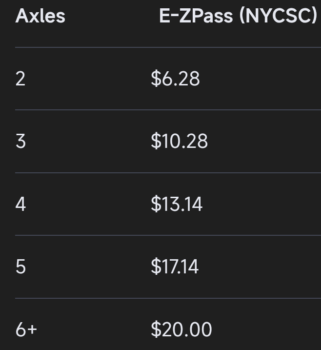все дураки, а дальнобои платят 120 долларов, потому что у них денег много. А EZPass для дальнобоя стоит 1.5 доллара в месяц. В 2025м услуга для дальнобоя в США стоит.....1.5доллара хех. Иди помойся, бобик блохастый, ты совсем уже от поехал грязной головой. Ватан, мост whitestone, он всего лишь две полосы в каждую сторону, даже он стоит от 45 долларов для грузовика с прицепом. Очнись, ты серешь