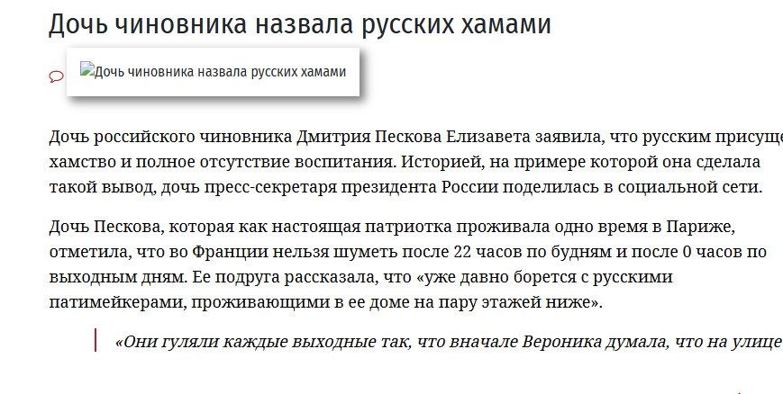>Дочь Пескова назвала русских невоспитанными хамами >Проблема русских людей заключается в их необразованности, откуда вытекает хамство и неуважение к окружающим. Об этом заявила дочь пресс-секретаря президента РФ Дмитрия Пескова, блогер Елизавета Пескова.