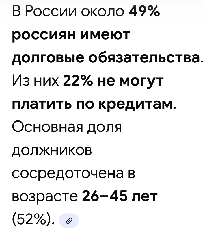>>61286097 > только если есть открытое судебное производство по долгам. Так про них речь же. Это 49% всех граждан блять и это трудоспособных разумеется и 52% из них мужчины от 26 до 45 лет. То есть, если ты читаешь как при живом муже Наташка едет в Турцию скакать на хуях - это сэдстори про куколда-должника нахуй. >>61286207 Мне похуй где вы там всей лахтой живете, я про то что из России рады бы наверное свалить дохуя кто при открытых границах, но блять долги не позволяют получить даже загранпаспорт. А хохол перешел границу с обычным паспортом и у него безвиз на весь ЕС и он там беженец с пособием как минимум. Создай такие условия и я посмотрю как бегут ебаные кидалы банков и МФО.