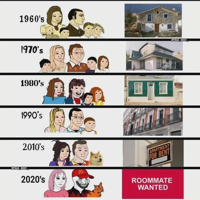 >>61287062 Ну так-то если из всего Запада брать именно Швятые, то там конечно жопа которой далеко до той жопы, в которой оказалась рашенька В том числе из-за вот этой повальной закредитованности населения. Был мем где-то (щас не найду уже), 30-е годы - большая многопоколенческая семья, 50-е - нуклеарная семья многодетная в своём доме, 90-е и нулевые - молодая пара в квартире, 20-е - раскрашенный фрик в квартире-студии. (((Кем))) это делается и для чего уже сто раз было разжёвано.