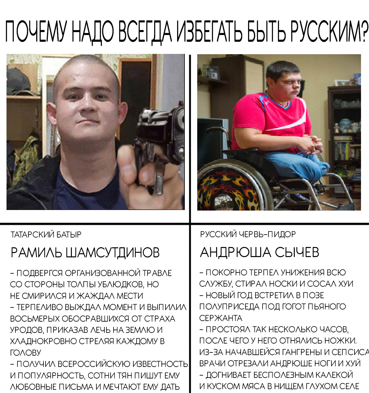 >>61290301 >Ты обвиняешь меня в трусости, но ты то сам сидишь на жопе и ни к кому не подойдёшь Так ты же пидорашка визжишь про трусливых кавказцев и боевых степашек, давай выходи хуле, боевая степашка, или ты пиздлявая лицемерная ссыкливая степашка? >Пойти в бой = быть смелым. Сесть в яму = быть смелым. Садись в яму пидорашка. >тут соревнование по быдлячему поведению устраиваем? Не пойти сдохнуть по указке хозяина где-то в чужой стране, вернуться к себе домой - быдлячее поведение. Пиздец больная скотина. Генетический куколд.
