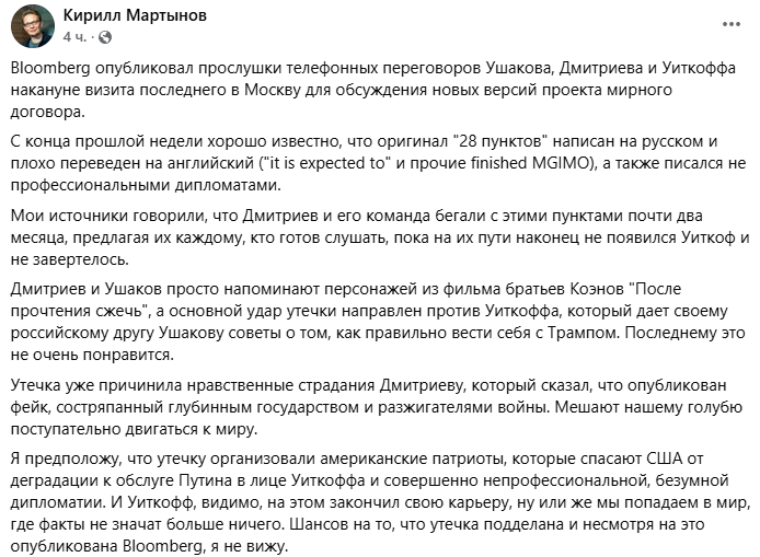 Блумберг слили разговор дмитриева и виткоффа и дмитриева с ушаковым, шутки про агента краснова после