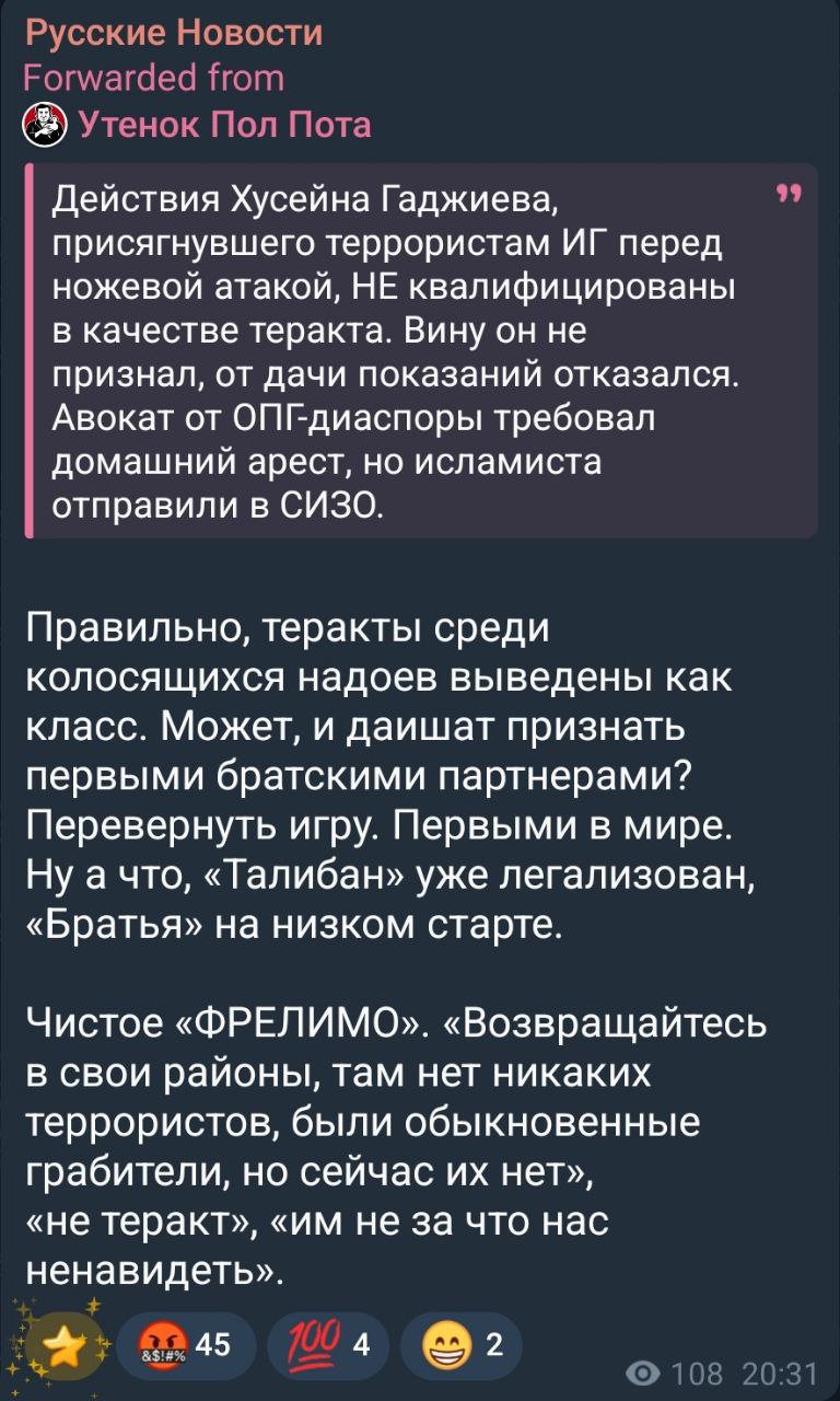 >>61296318 (OP) но по факту тут есть терроризм, и в любой стране его бы признали террористом. Покушение на жизнь по мотивам религиозной ненависти - это терроризм. И да, терроризм предусматривает бОльшие сроки, чем вся хуйня которую ему предъявляют, там максимум лет 5 получит.